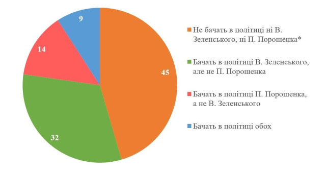 Загалом 45% респондентів не бачать в політиці після війни ні В.Зеленського, ні П.Порошенка.