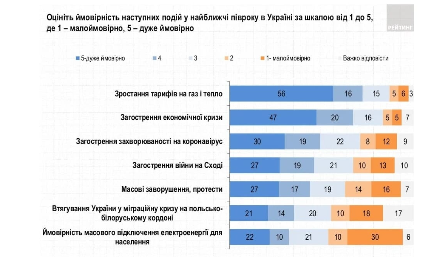Також соціологи поставили респондентам низку інших запитань з проханням оцінити ймовірність різних подій у найближчі пів року. Так, 72% вважають, що за шість місяців зростуть тарифи на тепло, а 67% — впевнені, що буде загострення економічної кризи.