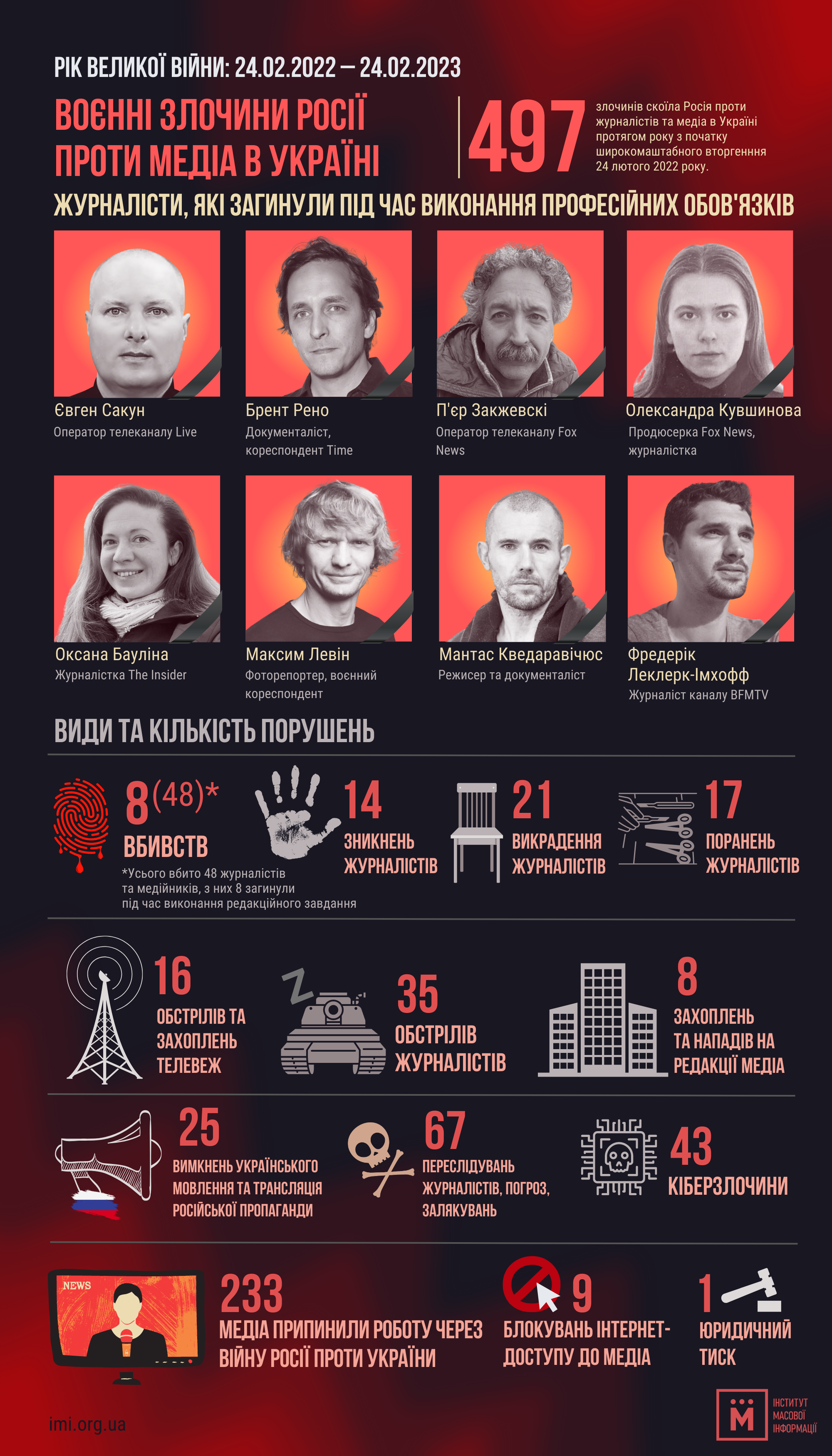 Станом на 24 лютого 2023 року вже 48 медійників загинули в Україні внаслідок російської збройної агресії. З них вісім – під час виконання журналістської діяльності, 27 загинули як учасники бойових дій та 13 – унаслідок російських обстрілів або катувань.