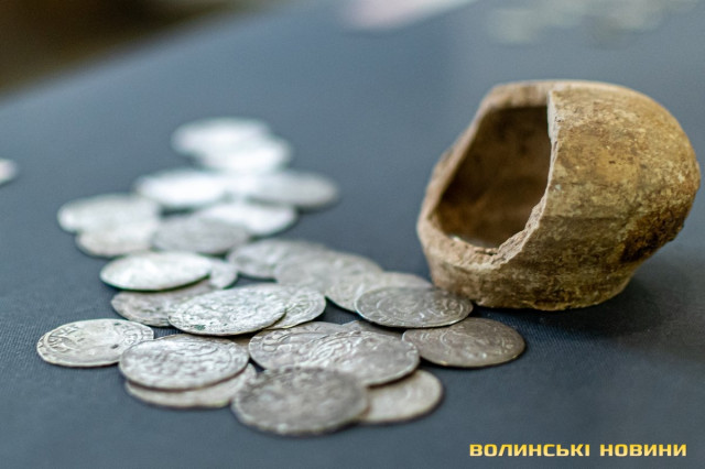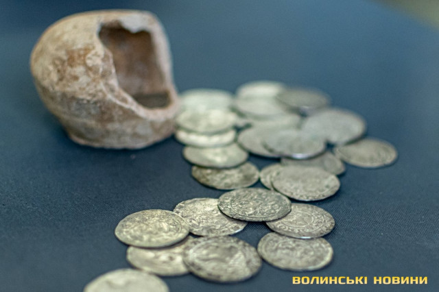Скарб празьких грошів знайшла експедиція під керівництвом Олексія Златогорського у селі Полонка Луцького району. 29 монет XIV ст містилися між дерев’яними конструкціями житла разом з уламками горщиків. Празькі гроші не дарма вважають своєрідними доларами XIV-XV ст. У Чехії були великі поклади срібла і держава монополізувала право на будь-які вироби з цього металу, не лише монети. Срібло було якісне і тому дуже поширилося Європою.Дослідники вважають, що гроші міг хтось заховати під час так званої луцької війни 1431 року, коли війська польського короля Ягайла облягли місто, де оборонялися прихильники князя Свидригайла.5. Рованцівський скарб