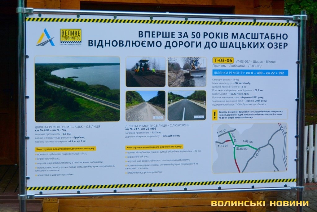 Окрім того, цьогоріч відремонтували ще одну дорогу до Шацька Т-03-06 /Т-03-02/ – Шацьк – Вілиця – Прип'ять – Любохини – /Т-03-08/, км 0 + 490 – км 22 + 992 на всій її протяжності у 22,5 км. На це витратили 169 мільйонів 137 тисяч гривень.Замість зношеної бруківки та білощебеневого покриття на всьому автошляху влаштували новий дорожній одяг – основу зі щебенево-піщаної суміші та два шари асфальту.На окремих ділянках дороги розширили проїзну частину з 4,5 метра до 6 метрів, основу посили щебенево-піщаною сумішшю. Вирівнювальний шар дорожнього покриття влаштували з дрібнозернистої асфальтобетонної суміші, верхній шар – з дрібнозернистої асфальтобетонної суміші з полімерними добавками. Також нанесли розмітку та встановили дорожні знаки.Генеральний підрядник ТзОВ «Луцькавтодор-Сервіс» дав п’ять років гарантії на виконані роботи.