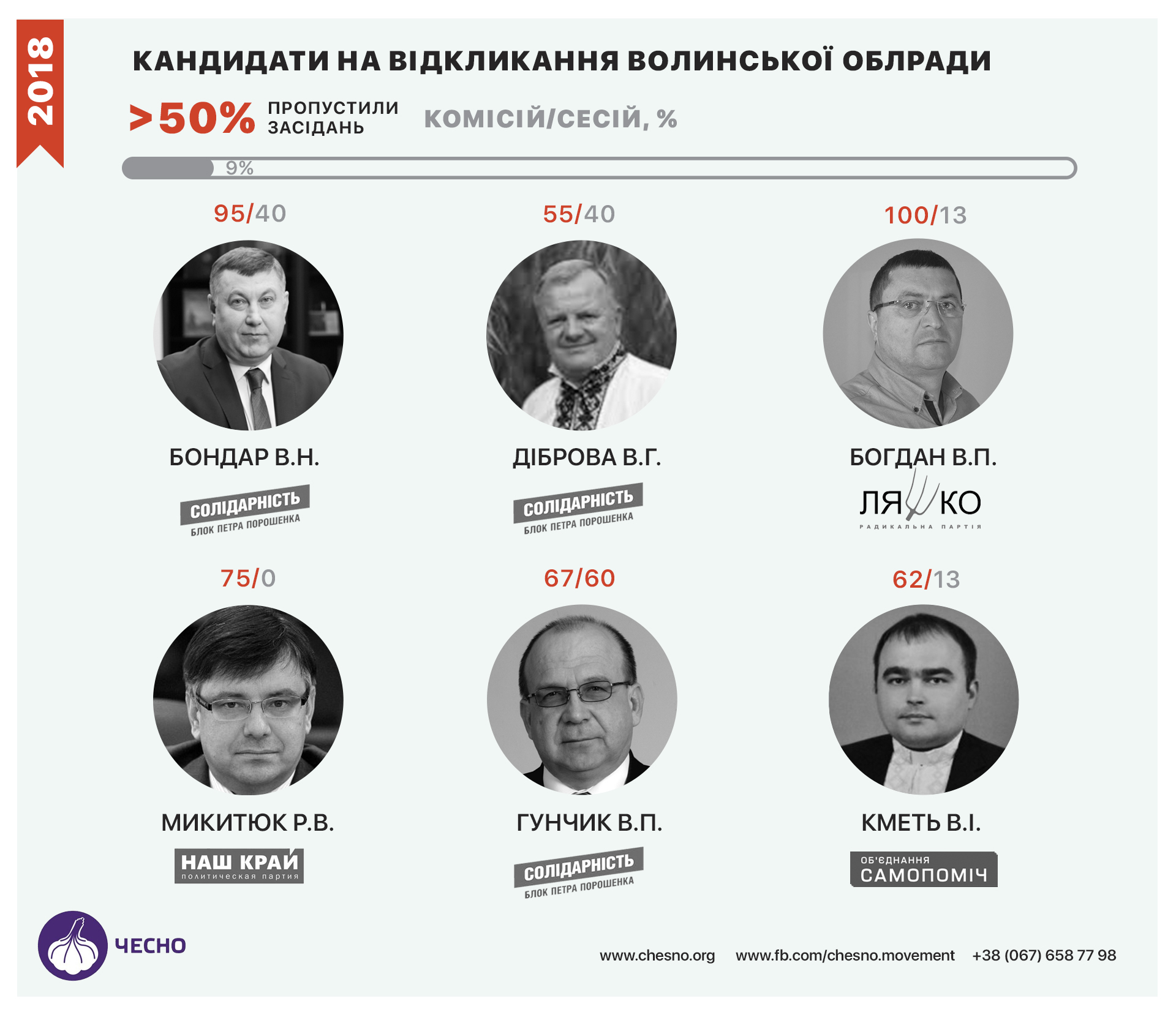 Отож, лідирують серед прогульників-депутатів Волинської облради представники від «БПП» Володимир Бондар, Володимир Гунчик, Валерій Діброва,а відповідно вони одні із перших кандидатів на відкликання. Наступними активними прогульниками стали позафракційні депутати Роман Микитюк(балотувався від партії «Наш край», фракція якої в облраді розпалася наприкінці 2017 року), В’ячеслав Богдан (ішов на вибори від «радикалів») та Володимир Кметь від «Самопомочі».
