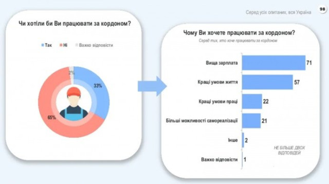 На Донбасі виїхати на роботу закордон хочуть вдвічі менше осіб, ніж у західних областях (20-23% проти 40%).Основними причинами, чому хочуть працювати за кордоном, українці обрали вищу зарплату (71%) та кращі умови життя (57%). Ще по 20% обрали кращі умови праці й можливість самореалізації. Однак для молодших можливість самореалізації більш важлива, ніж для представників старших вікових груп.Опитування проводилось з 20 липня до 9 серпня серед 20 тисяч респондентів в усіх областях, крім тимчасово окупованих територій Криму та Донбасу.