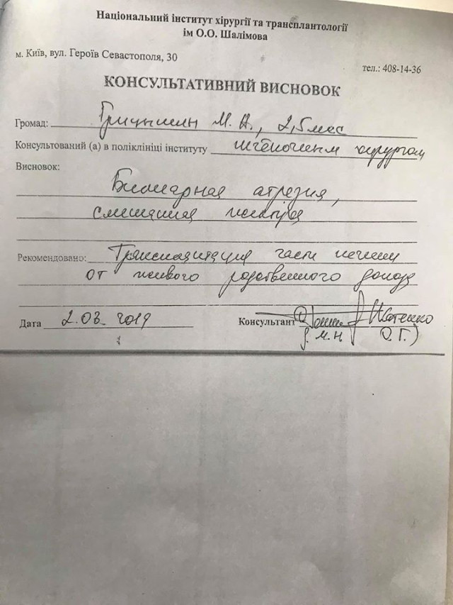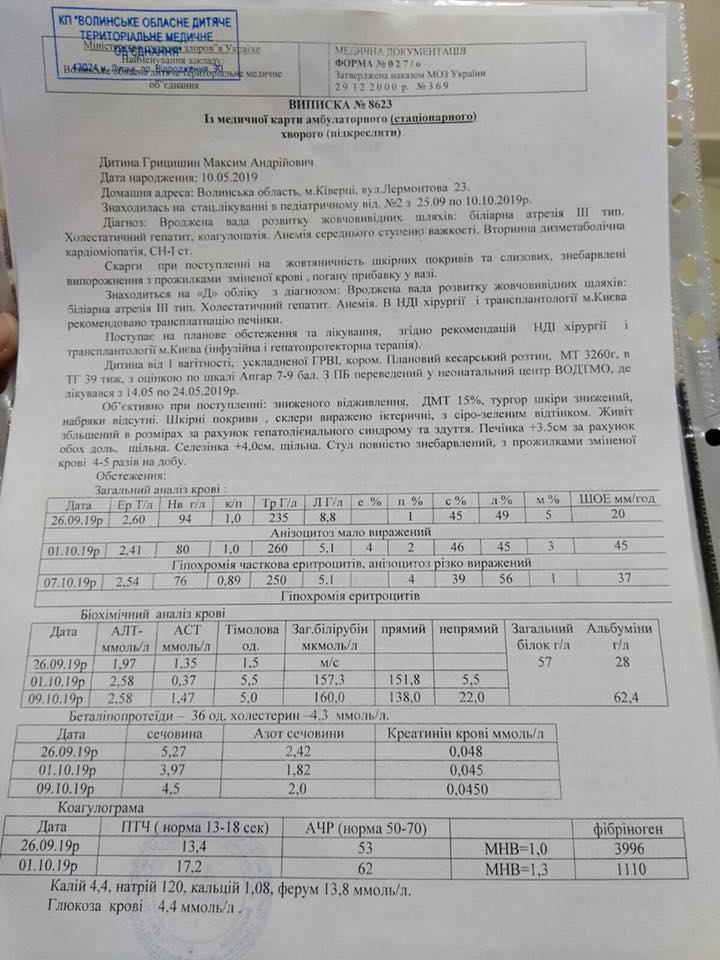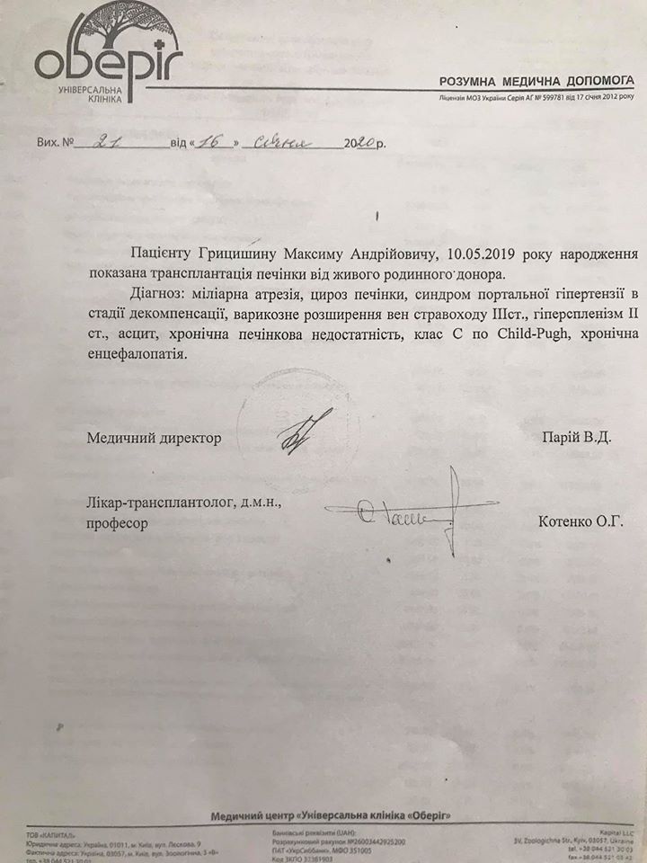 Грицишину Максиму Васильовичу, 10.05.2019 року народження, лікарі поставили невтішний діагноз – міліарна атрезія, цироз печінки, синдром портальної гіпертензії в стадії декомпенсації, варикозне розширення вен стравоходу ІІІ ст., гіперспленізм ІІст., хронічна печінкова недостатність, хронічна енцифалопатія.