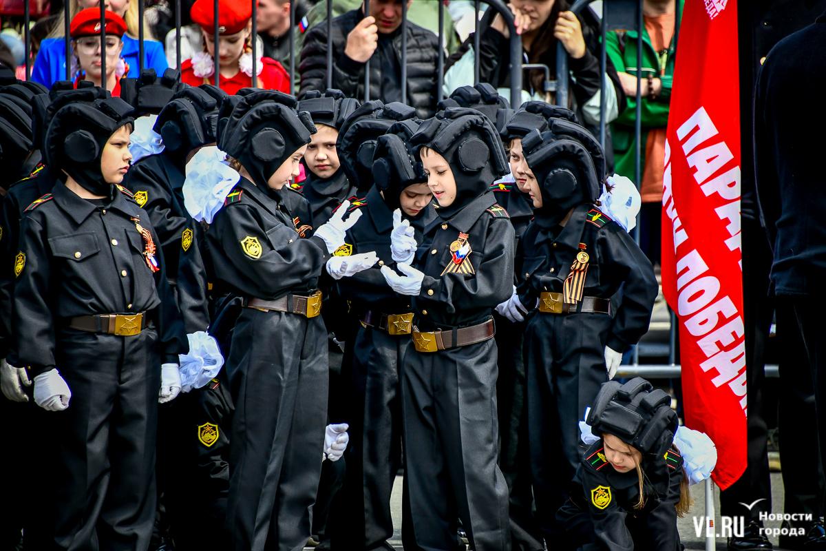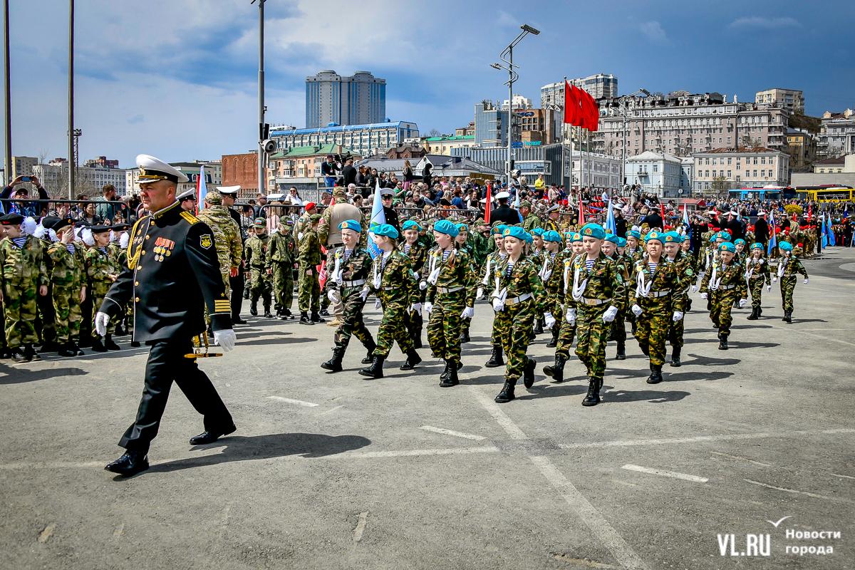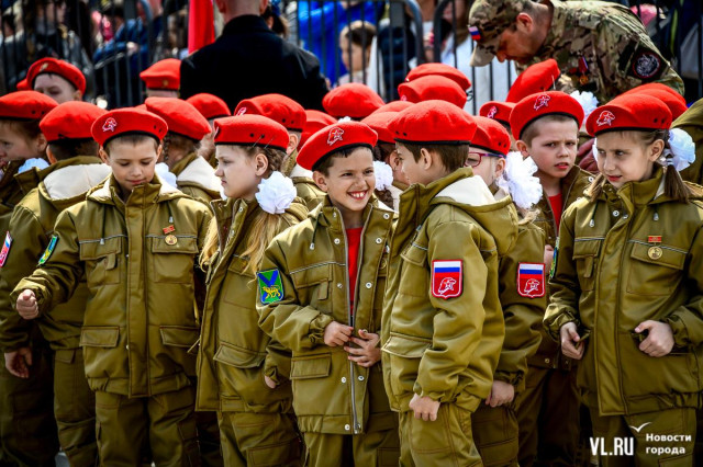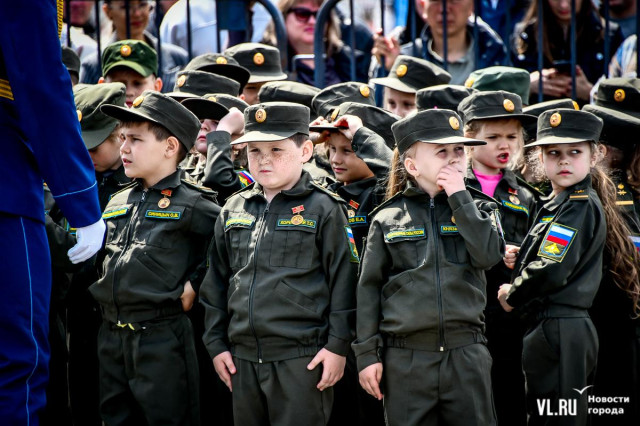 У російському Владивостоці влаштували дитячий парад «Правнуки Перемоги» – у ньому взяли участь 1500 учнів молодших класів, яких вбрали у форму різних родів військ.