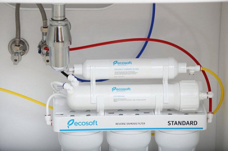 - Кілька фільтрів, що працюють поетапно: фільтри для попереднього очищення, мембрани зворотного осмосу.