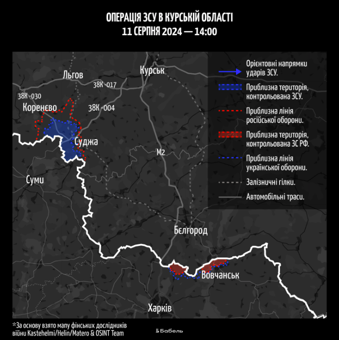 Бабель зібрав усе, що відомо про операцію ЗСУ станом на 11 серпня з відкритих джерел (повідомлень осінтерів, українських пабліків, Z-пабліків і пабліків населених пунктів Курської області). Ці дані зʼявляються із затримкою, поточна ситуація відрізняється від тієї, що показана на карті.