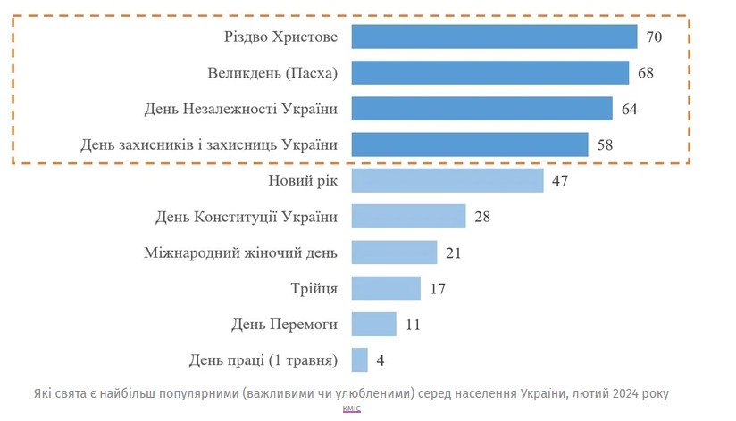 Крім цього, згідно з дослідженням, до п’ятірки найпопулярніших свят також увійшли: Різдво Христове – його святкують 70% опитаних; Великдень – 68%; Новий рік – 47%.