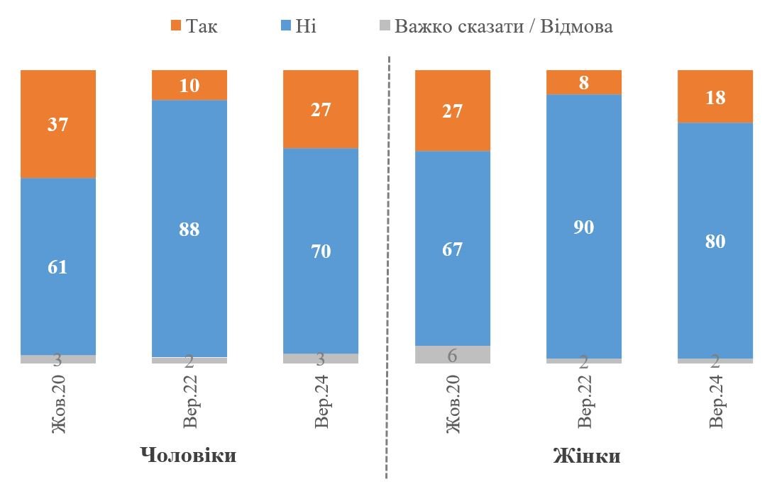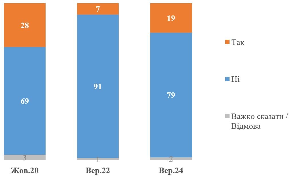 Наразі ж готовність переїхати за кордон, порівняно із вереснем 2022 року, зросла до 19%, проте лишається помітно нижчою, ніж було у 2020 році.