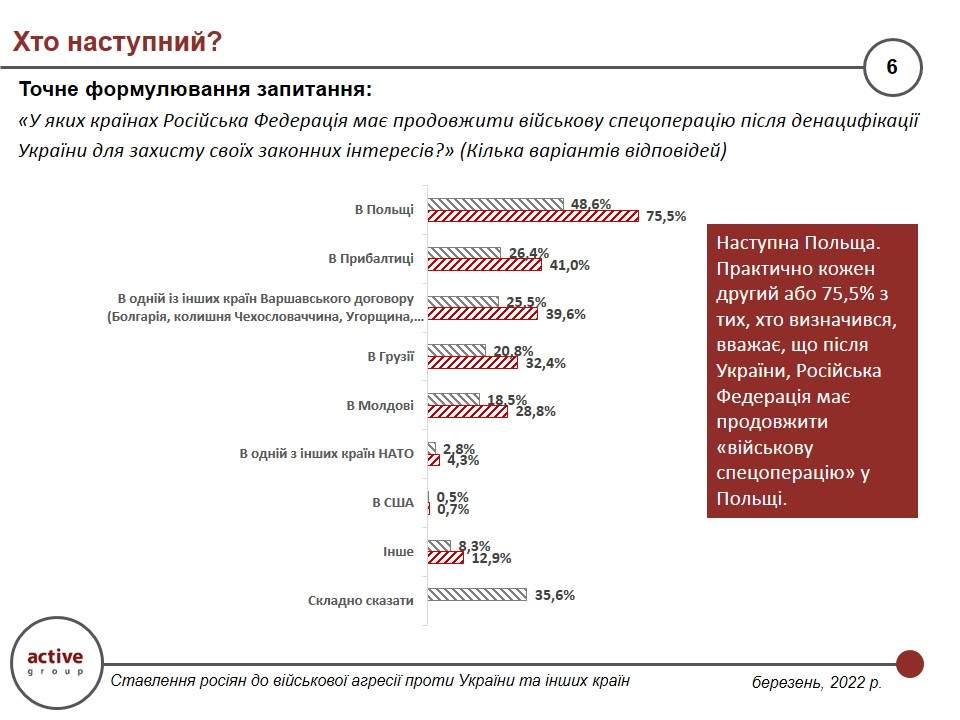 Трійка країн, які згідно з соціологічним опитуванням стануть наступними жертвами нападу Росії – це Польща (75,5% опитаних), країни Балтії, серед яких Естонія, Литва, Латвія (41%), а також Болгарія, Чехія, Словаччина та Угорщина (39, 6%). Під час опитування респонденти мали змогу обирати кілька країн.Варто зазначити, що про негативне ставлення до збройного вторгнення до інших країн сказали лише 13,4% жителів РФ.