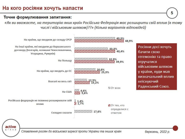 «Спільне враження інтерв’юерів від опитування – росіяни, які погоджувалися спілкуватися, агресивно налаштовані стосовно не лише України, а і Євросоюзу та НАТО. Респонденти або відмовляються від спілкування, дізнавшись тему інтерв’ю, або декларують готовність підтримувати та схвалювати подальші вторгнення РФ до інших країн», – розповів засновник дослідницької компанії «Active Group» Андрій Єременко.