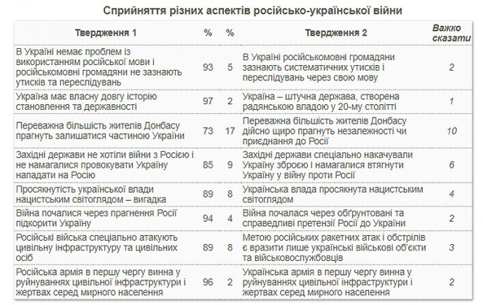 «Не менше 85% респондентів вважають, що в Україні немає утисків російськомовного населення (зокрема, так вважають 85% етнічних росіян і 90% російськомовних жителів України), що Україна має власну довгу історію становлення та державності (а не є «штучним» витвором радянської влади), що західні держави не хотіли і не провокували Україну на війну проти Росії.