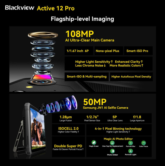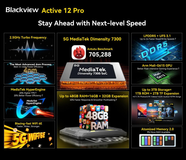 Blackview офіційно оголошує про глобальний дебют Active 12 Pro (https://s.click.aliexpress.com/e/_oDP8ODm), першого у світі захищеного планшета з підтримкою 5G, оснащеного вбудованим 200-люменним DLP-проектором з роздільною здатністю 1080P з автофокусуванням. Створений для мобільних професіоналів, польових робітників та любителів активного відпочинку, він трансформує категорію захищених пристроїв завдяки рідкісному поєднанню міцності, проекції, флагманської продуктивності, інтеграції штучного інтелекту та автономної роботи протягом усього дня в одному планшеті.