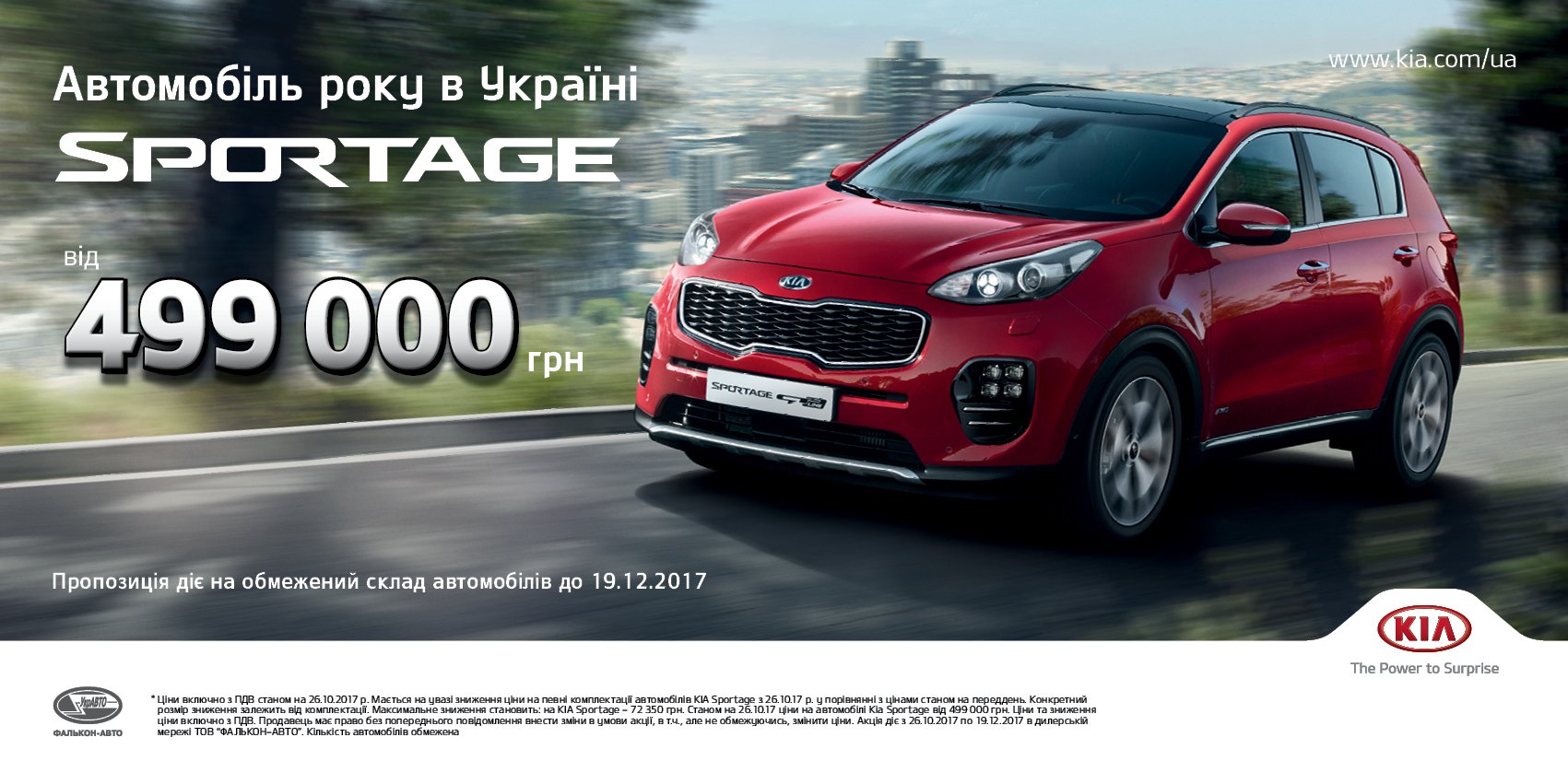 Нагадаємо, що за результатами продажів протягом 10 місяців 2017 року Kia Sportage є найпопулярнішою моделлю на українському ринку нових автомобілів.* Ціни наведено включно з ПДВ станом на 26.10.2017 р. Йдеться про зниження ціни на певні комплектації автомобілів КІА Sportage з 26.10.17 р. у порівнянні з цінами станом на переддень. Конкретний розмір зниження залежить від комплектації. Максимальне зниження становить: на КIA Sportage - 72 350 грн. Станом на 26.10.17 ціни на автомобілі Kia Sportage від 499 000 грн. Ціни та зниження ціни включно з ПДВ. Продавець має право без попереднього повідомлення внести зміни в умови акції, в т.ч., але не обмежуючись, змінити ціни. Акція діє з 26.10.2017 по 19.12.2017 в дилерській мережі ТОВ "ФАЛЬКОН-АВТО". Кількість автомобілів обмежена. Кількість акційних автомобілів вказано станом на 26.10.2017.