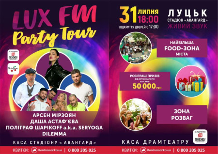 Радіо «Люкс ФМ» за підтримки луцької івент-агенції Tikhonov сoncertandeventagency організовують 31 липня на стадіоні «Авангард» масштабне дійство, на котрому крім таких зіркових артистів, як Арсен Мірзоян, Даша Астаф’єва, ПОЛІГРАФ ШАРІКOFF a.k.a. SERYOGA, гурту «DILEMMA» та ведучих Слави Дьоміна і Василіси Рядних, команда організаторів підготувала надзвичайно багато сюрпризів, подарунків та акцій.