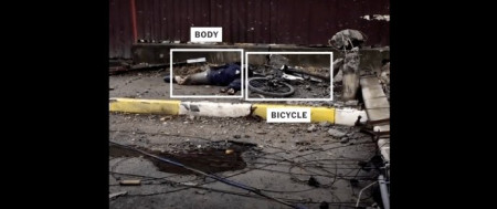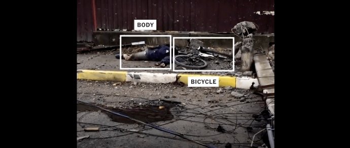 Після того як росіяни вийшли з Бучі, тіло буле зняте поряд з велосипедом саме в цьому місці на другому відео, підтвердженому NYT.На кадрах з повітря російські бронемашини виглядають як БМД-4, зазвичай оснащені 100-міліметровою гарматою та 30-міліметровою гарматою.