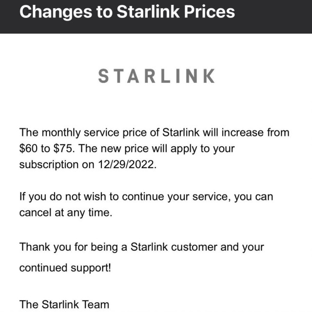 «Якщо ви не бажаєте продовжувати користуватися сервісом, ви можете скасувати підписку у будь-який час», – йдеться у листі, що розповсюдили в українському сегменті мережі.Також стало відомо, що для отримання терміналу Starlink з офіційного сайту в Україну доведеться заплатити $700 доларів і $50 за доставку. Раніше замовлення терміналу до України коштувало близько $400.Зазначимо, що від початку повномасштабного вторгнення РФ термінали Starlink стали життєво необхідними для українців: військові забезпечують себе зв’язком на передовій, а для цивільних інколи це єдиний доступ до зв’язку в умовах блекауту. Термінали Starlink є у багатьох пунктах незламності та платних коворкінгах України.