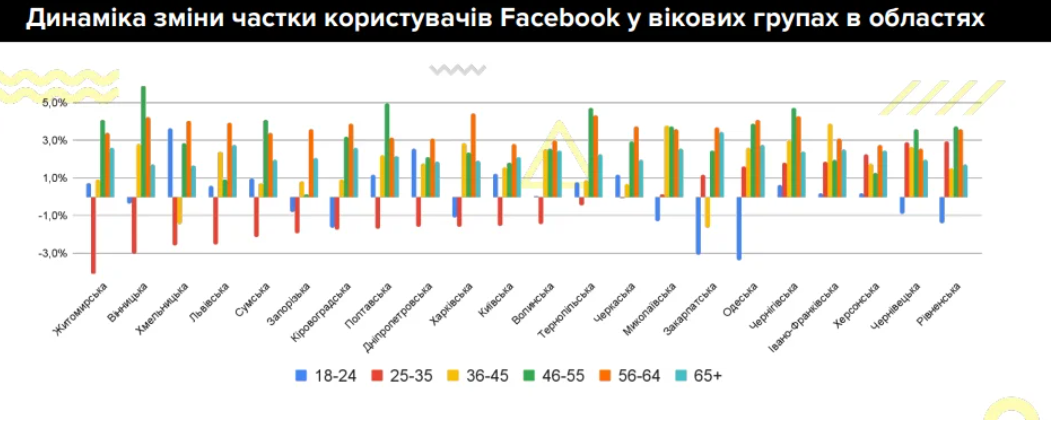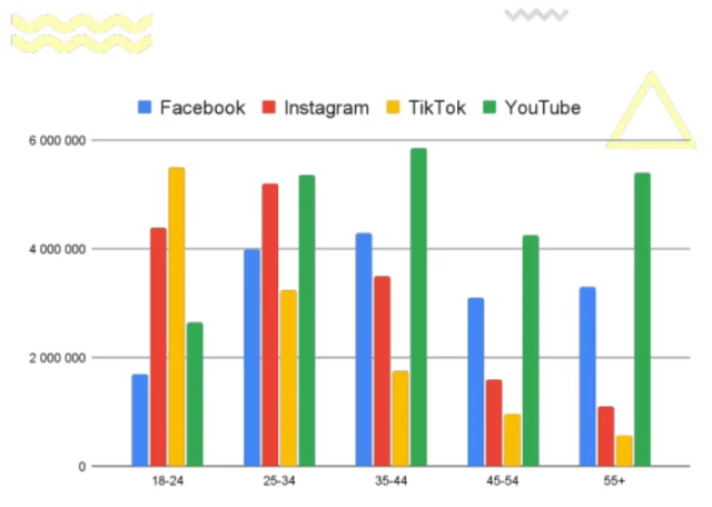 Найпопулярнішою соцмережею серед повнолітніх українців є YouTube. Аудиторія цього сервісу становить 23,5 млн користувачів, аудиторія Facebook – 16,4 млн користувачів старше 18 років.Для українців віком понад 35 років Facebook є другою соцмережею після YouTube.На третьому місці за кількістю повнолітніх користувачів Instagram з аудиторією 15,8 млн, а на четвертому – TikTok. Популярним серед молоді додатком користуються 12 млн українців віком від 18 років.YouTube випереджає інші соцмережі в Україні у чотирьох із п’яти вікових категорій.