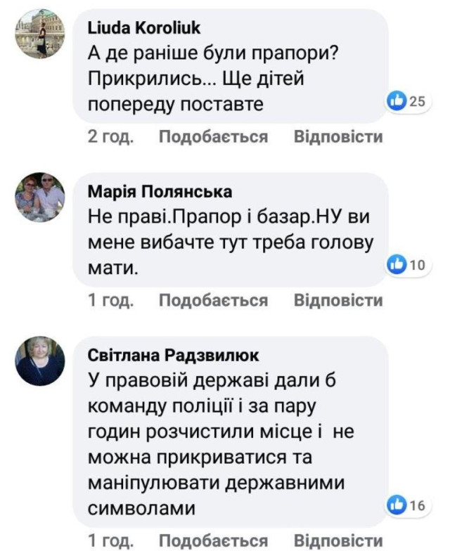 «А де раніше були прапори? Прикрились... Ще дітей попереду поставте».«У правовій державі дали б команду поліції і за кілька годин розчистили місце. І не можна прикриватися та маніпулювати державними символами».