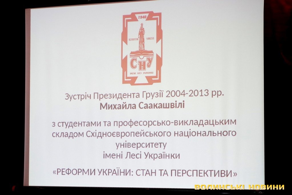 На годиннику 15:17, експрезидент Грузії нарешті з’явився у залі під оплески публіки. Він зайняв місце у першому ряді та очікував представлення.«Маємо за велику честь приймати та зустрічати президента Грузії Михеіла Саакашвілі. Ми щиро вдячні, пане президенте, що ви знайшли час у своєму щільному графіку відвідати наш університет імені Лесі Українки та провести лекцію для наших студентів і працівників університету. Я надіюсь, що у нас буде гарна, щира, чітка розмова, хороша дискусія», – запросив до слова Міхеіла Саакашвілі ректор СНУ Анатолій Цьось.Нарешті політик піднявся на сцену. Українською мовою з помітним грузинським акцентом Міхеіл Саакашвілі подякував керівництву університету, яке запросило його, також він відзначив високу підготовку студентів юридичного факультету, з якими мав розмову, і нарешті перейшов до спічу по темі.