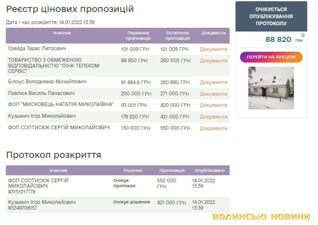 Лотом зацікавилися семеро покупців, тож торги були жваві і ціна підскочила в рази. Найбільше запропонував підприємець Сергій Солтисюк, якого система й визначила переможцем. Наразі очікується опублікування протоколу і підписання договору з переможцем.Юлія МАЛЄЄВА