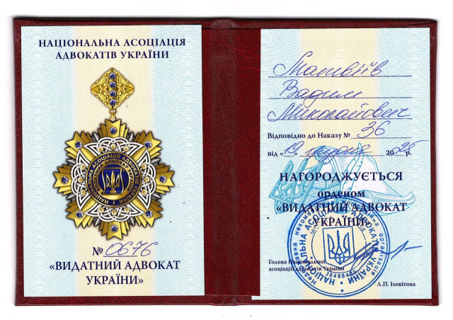 Вадим Матвіїв отримав відзнаку «Видатний адвокат України». Це найвища нагорода Національної асоціації адвокатів України.