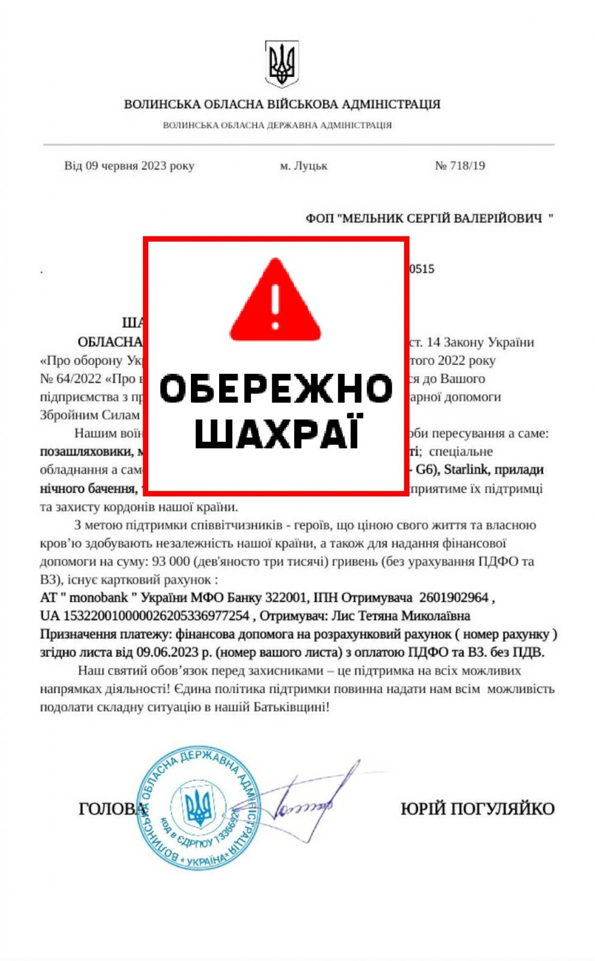 До волинських підприємців знову надходять шахрайські листи та телефонні дзвінки від імені начальника ОВА Юрія Погуляйка з проханням перерахувати кошти для ЗСУ.