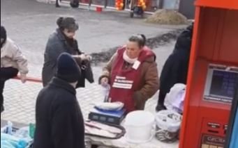 Чоловік зняв на камеру, як жінка, яка, ймовірно працює агітатором від кандидата у президенти Петра Порошенка, одночасно продає рибу.