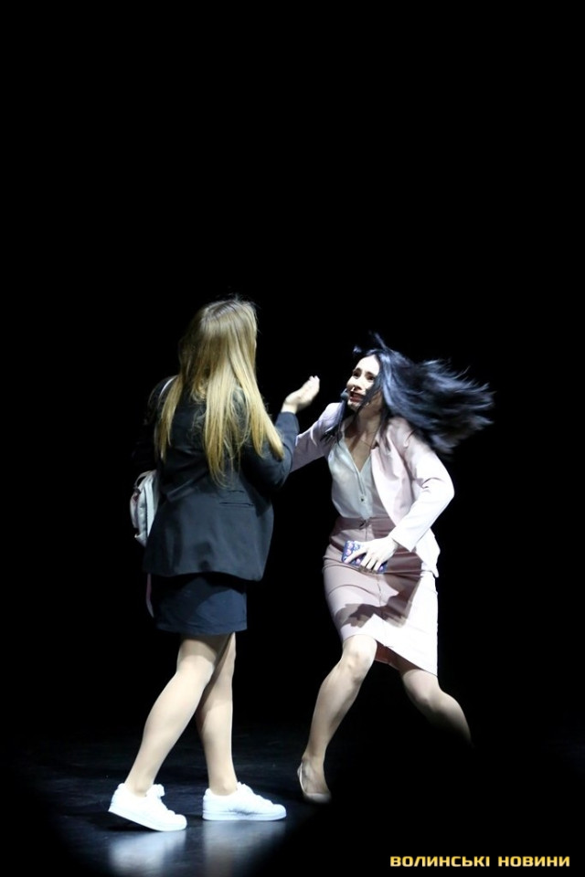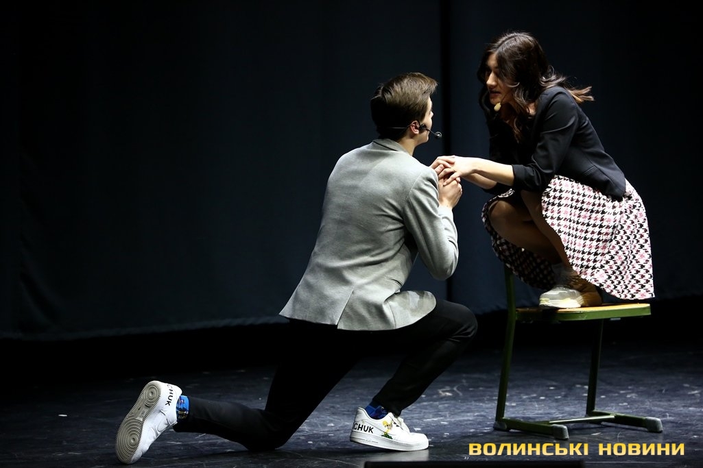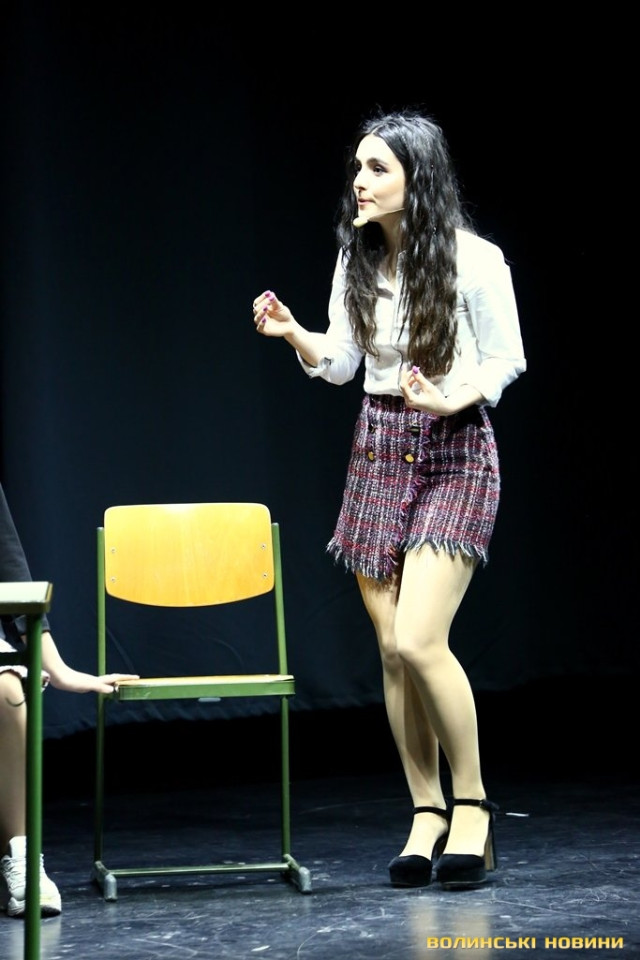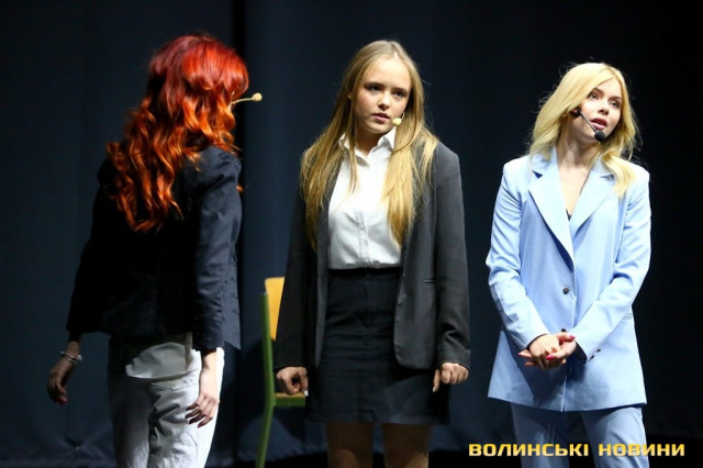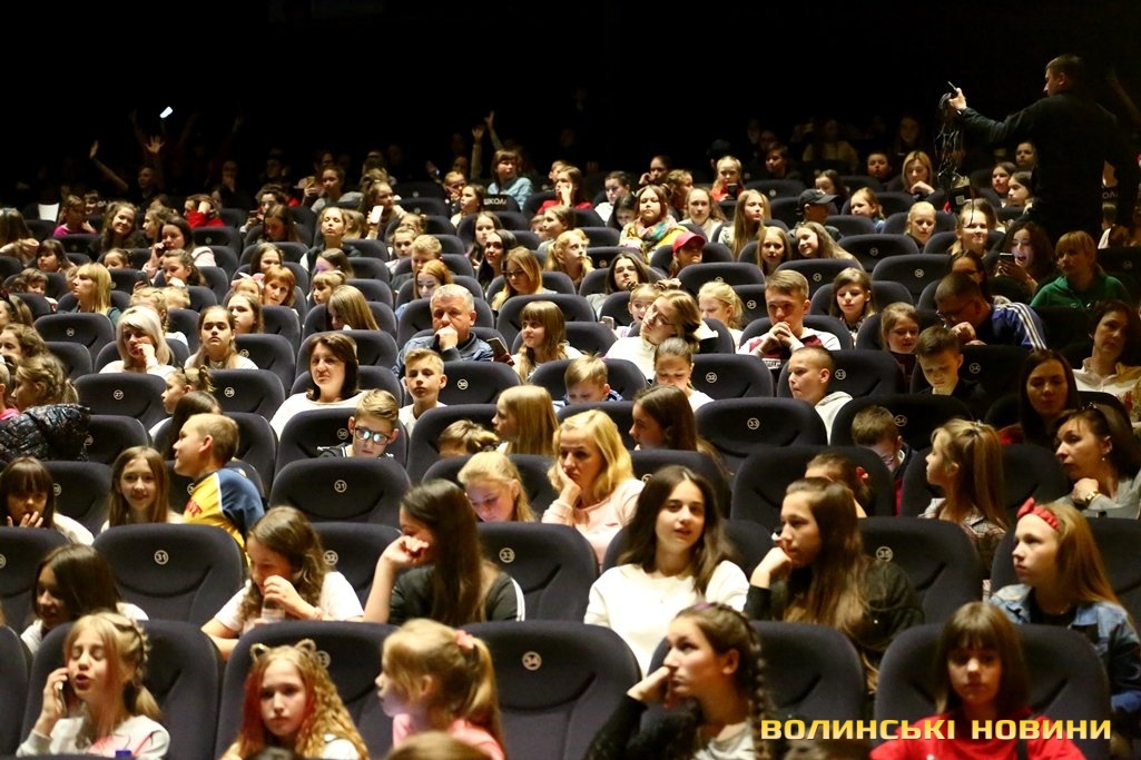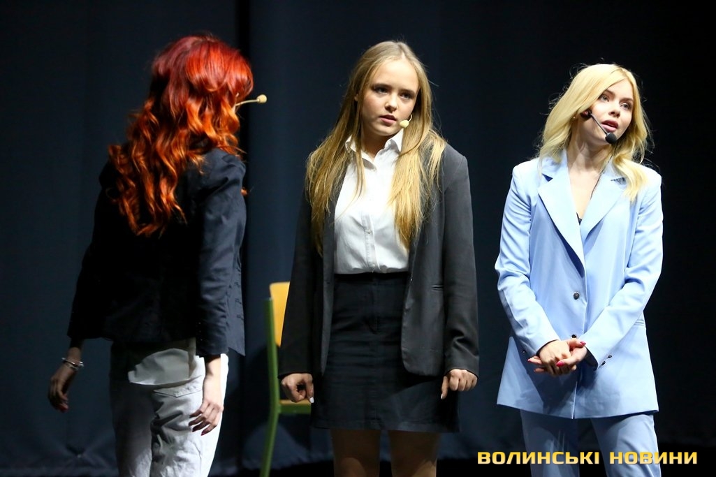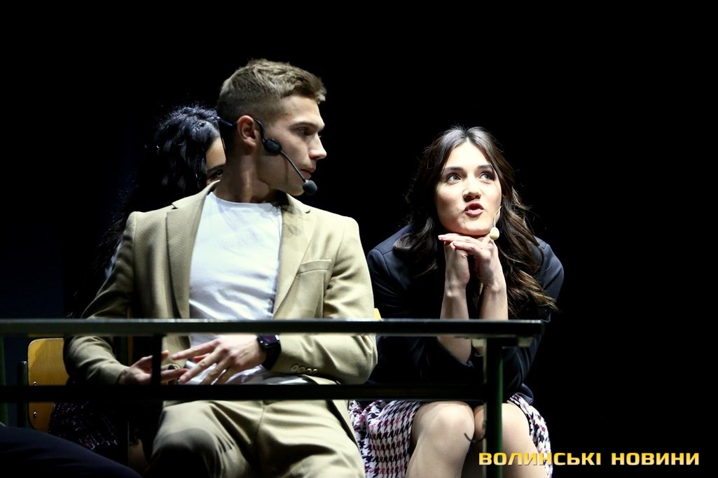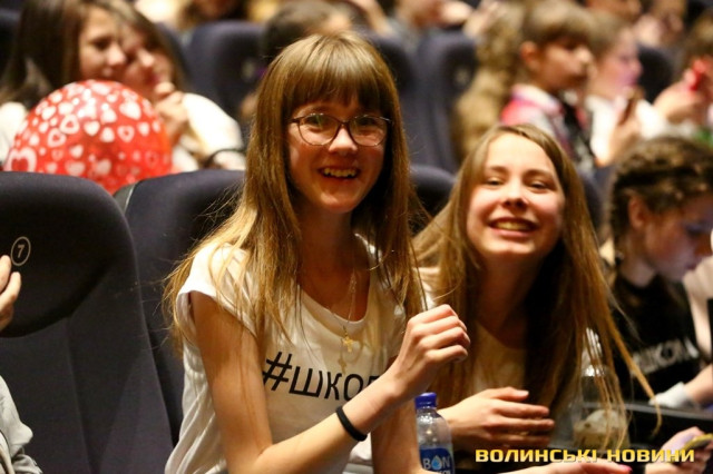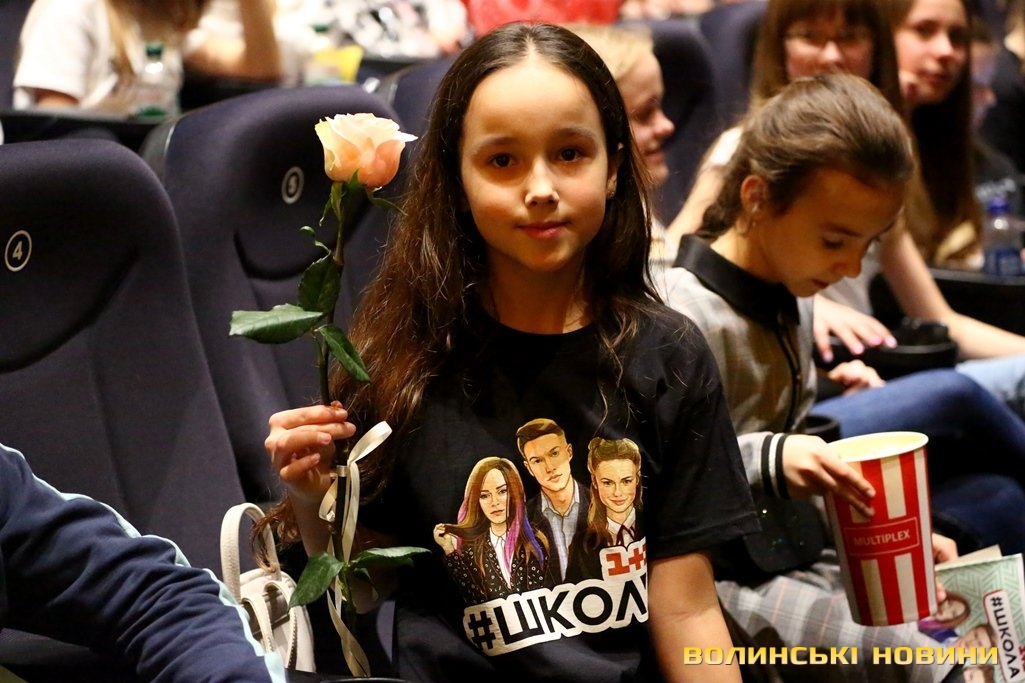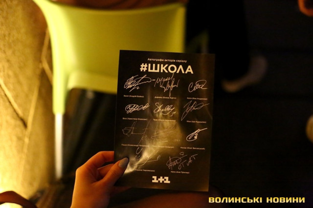 Коли ж вона запропонувала дітям підійти ближче, у залі розпочався справжній ажіотаж – школярі з поспіхом покидали свої місця і прямували до сцени.Справжнє ж безумство розпочалося, коли Вероніка оголосила про довгоочікуваний вихід на сцену акторів серіалу «Школа». До Луцька приїхали, зокрема, Анна Трінчер (Ната), Ірина Кудашова, Богдан Осадчук, Олег Виговський, Марія Кондратенко (Соня), Яніна Андреєва (Катя) та інші.Вони розіграли перед лучанам невелику інтерактивну виставу. У центрі подій – підготовка до кастингу на участь у серіалі «Школа» учнів 10 та 11 класів, які б мали приділяти час підготовці до контрольних і майбутнього зовнішнього незалежного оцінювання.