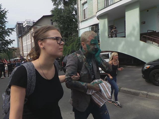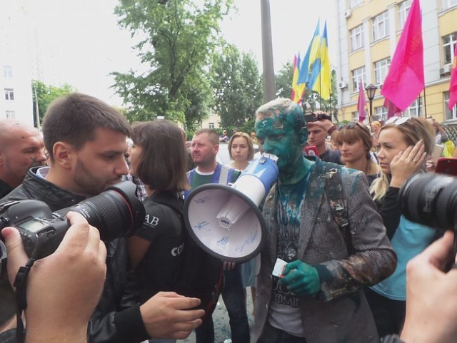 У Києві главу правління Центру протидії корупції Віталія Шабуніна активісти облили зеленкою.