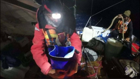 Пізнього вечора 5 вересня атака акул повторилася, вони прокусили правий балон. Катамаран почав тонути, команда подала сигнал SOS. Береговий штаб експедиції зв’язався з австралійськими рятувальниками, і вже через 45 хвилин до катамарана підійшло суховантажне судно, що прямує до Шанхаю.