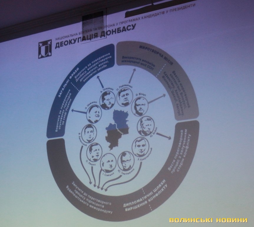 Так, у галузі національної безпеки та оборони проаналізували позиції кандидатів щодо деокупації Донбасу. За вирішення конфлікту дипломатичним шляхом виступають Зеленський, Ляшко, Смешко, Тимошенко та Кошулинський. Зокрема, вони пропонують залучити до переговорного процесу підписантів Будапештського меморандуму. Юрій Бойко вважає, що потрібно вести переговорний процес з залученням сторін конфлікту. Загалом боротися за повернення окупованих територій обіцяють Шевченко та Гриценко. Прихильниками миротворчої місії є Порошенко (використання механізму міжнародної місії ООН) та Вілкул (за введення миротворчого контингенту, у тому числі, Білорусі та Казахстану, що пов’язані з РФ).