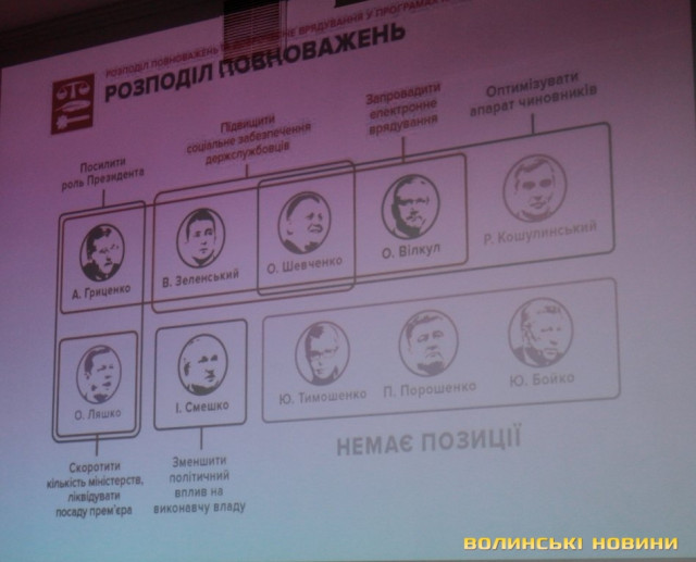 Щодо розподілу повноважень, за посилення ролі президента виступають Гриценко та Ляшко (який взагалі планує скасувати посаду прем’єр-міністра), підвищити соціальне забезпечення держслужбовців хочуть Зеленський та Шевченко, оптимізувати апарат чиновників – Кошулинський, Вілкул та Шевченко. Не мають позиції з цього питання Тимошенко, Порошенко та Бойко.