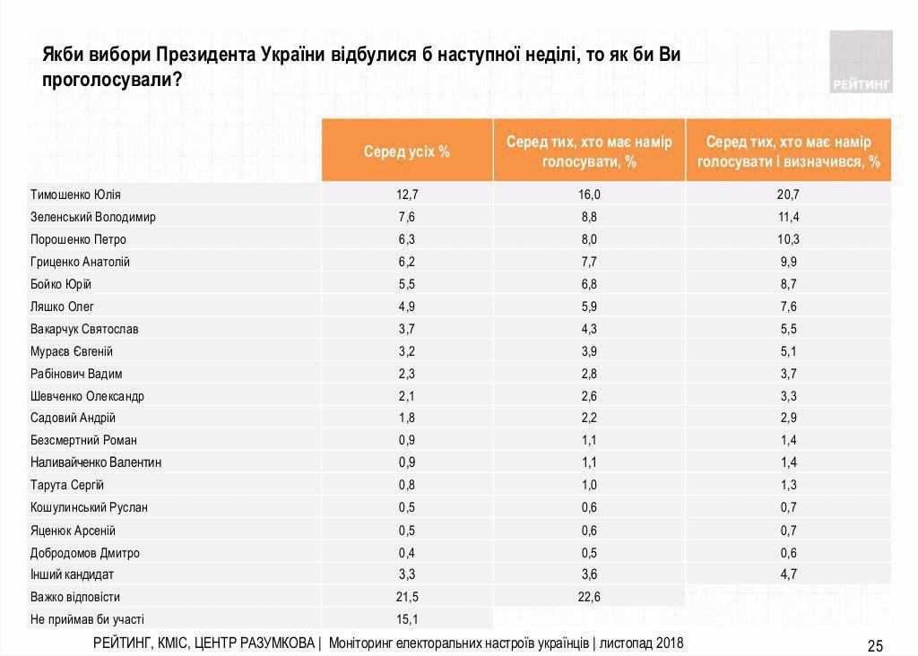 У його найближчих конкурентів Володимира Зеленського та Юлії Тимошенко, яка очолює рейтинг - 7,6% і 12,7% відповідно.