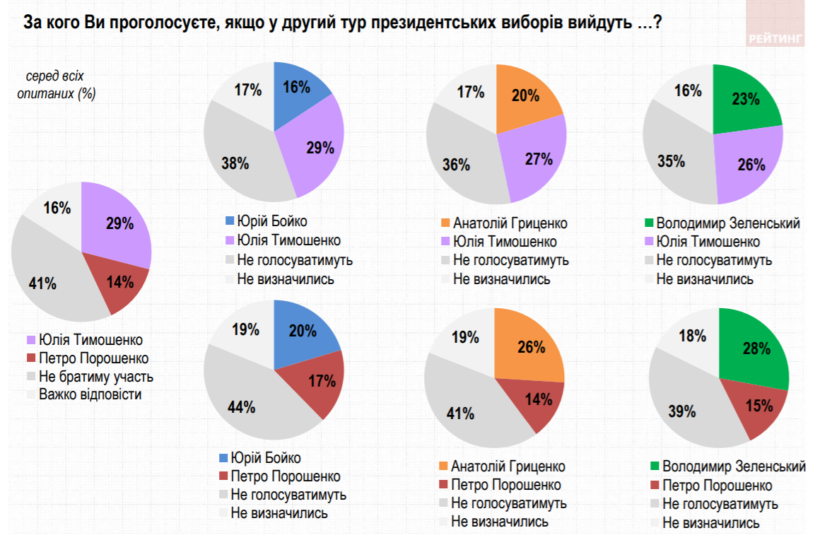 Втім, якщо навіть Порошенко проривається до другого туру, то всім потенційним конкурентам з таким самим рейтингом він програє - Тимошенко, Гриценку, Зеленському та Бойко.