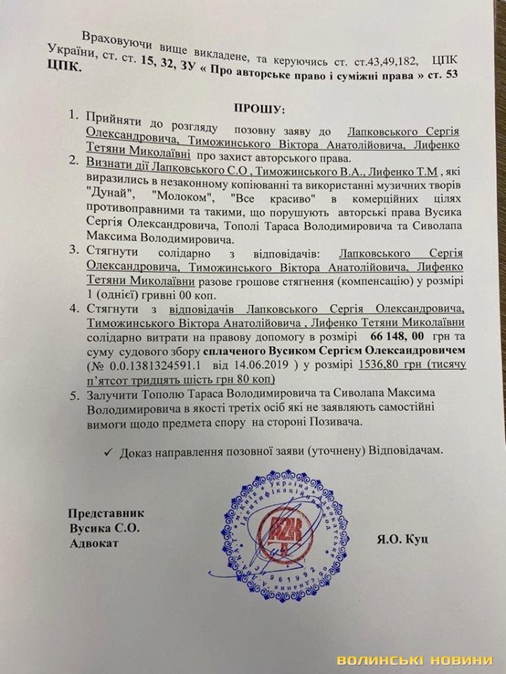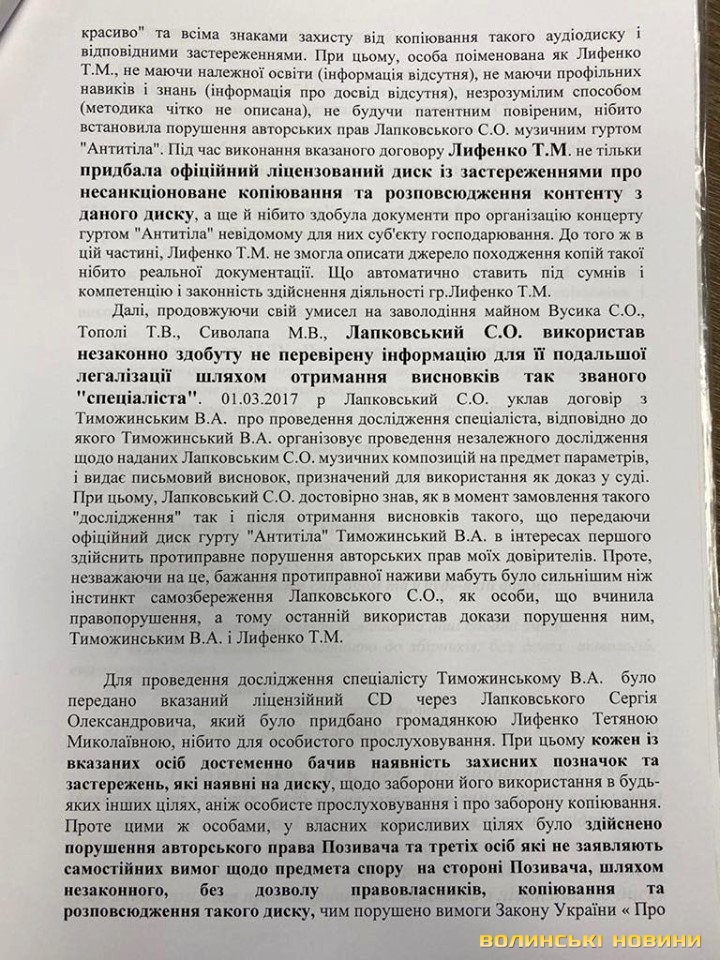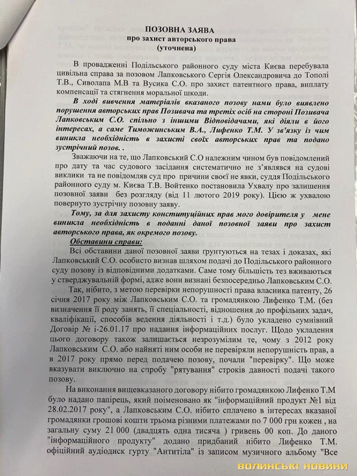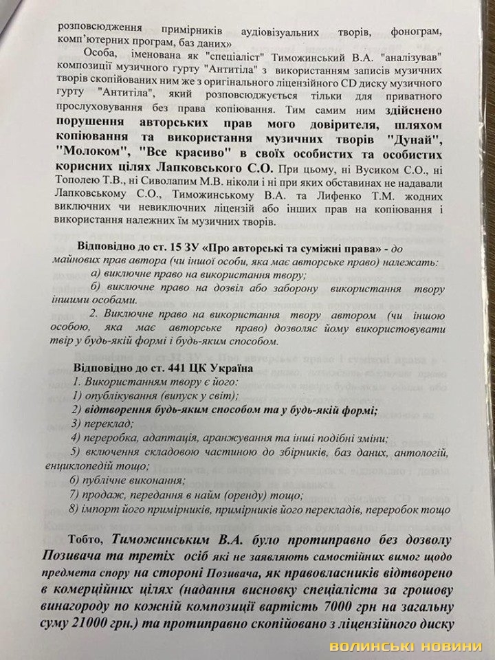 «Ми базуємось на тому, що дані про порушення авторських прав, які полягають у копіюванні композицій без ліцензійної угоди, без дозволу Вусика, Тополі та Сиволапа, підтверджені у висновках так званих спеціалістів Тиможинського і Лифенко. Вони дійсно це зробили в комерційних цілях, адже вони отримали за це плату від Лапковського – по 7 тис. грн. за одну композицію. І шукали вони порушення патенту Лапковського тільки серед пісень гурту «Антитіла».