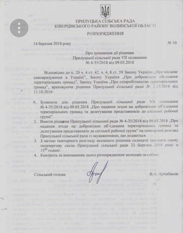 Як відомо, 4 жовтня голова Прилуцької сільської ради Валентин Арчибасов ветував таке ж рішення про об'єднання з Луцьком, яке було прийняте депутатами сільради 29 вересня 2017 року.