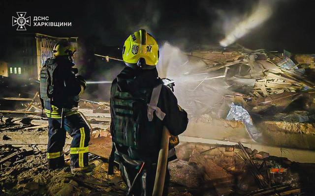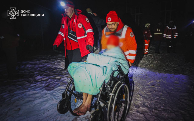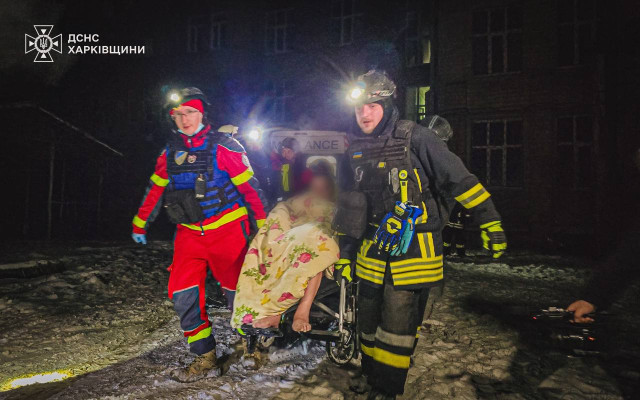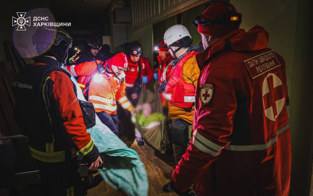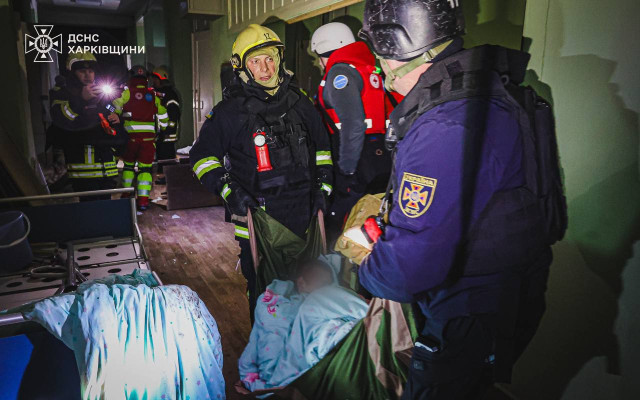 «Один із безпілотників влучив у триповерхову будівлю медзакладу, спричинивши пожежу на даху. Спільними зусиллями рятувальників, поліції, медиків і волонтерів евакуйовано 64 людини, серед них – 56 пацієнтів та дитина», – повідомило ГУ ДСНС у Харківській області.