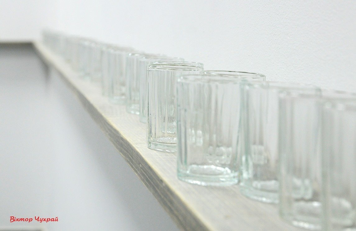 Олександр Паньковець: «Я схиляюся більше до абстрактного бачення: форма і наповнення – вічні речі, які можна накладати на будь-який процес. Було б добре, якби кожен зайшов і придумав свою концепцію, але відштовхувався все-таки від того, що хотіли сказати організатори. Я думаю, наповнення тих мультиформ, які там є, допоможуть вам задокументувати коротку концепцію на аркуші паперу».Лаконічно і конкретно: в галерейному «резервуарі» полиці з чарками. У кожній чарці – алкоголь. Дивишся, береш чарку, випиваєш, думаєш, пишеш на папері власну «концепцію» – тост, побажання, думку, що завгодно… Спілкуєшся з людьми.Чи важлива організаторам ідентифікація формату свого заходу: виставка, перформанс, акція..? На думку Олександра Паньковця, таке визначення зараз несуттєве, бо він спостерігає повноту процесу: «Люди ходять, роздивляються, випивають, щось пишуть – це інтеграція багатьох процесів, візуального ряду. Все ж продумано! І ми максимально чесно “відділили мух від котлет”».