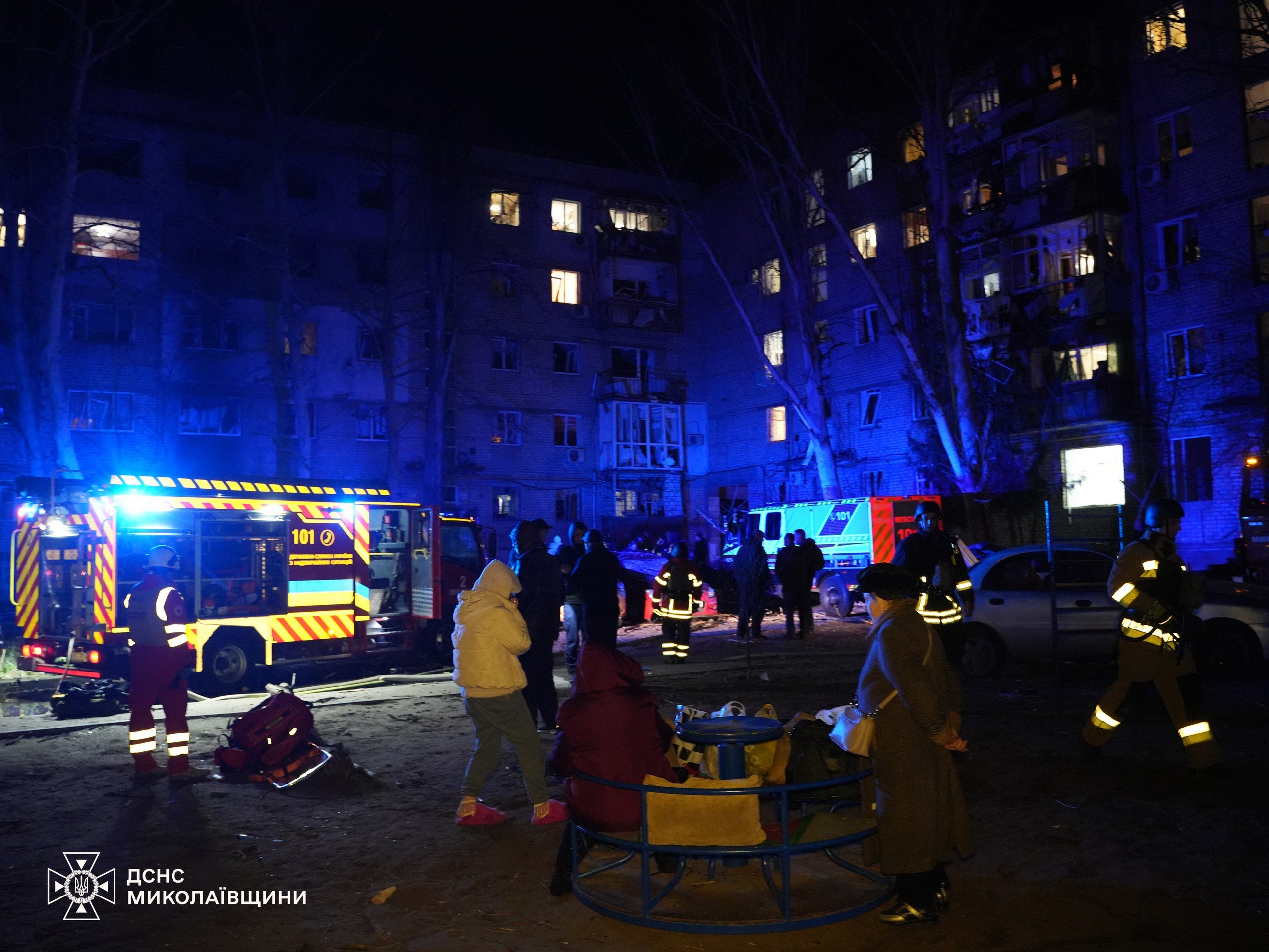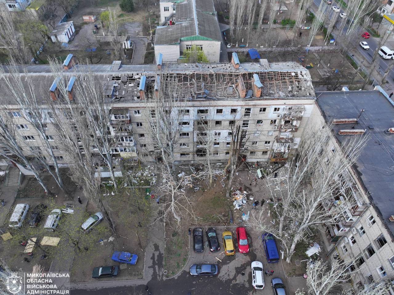 У ніч на 10 квітня росіяни атакували Миколаїв «Шахедами». Унаслідок падіння уламків збитих російських ударних безпілотників 10 людей дістали поранення, у місті пошкоджено житлові багатоповерхівки, адмінбудівлю, десятки гаражів та авто.