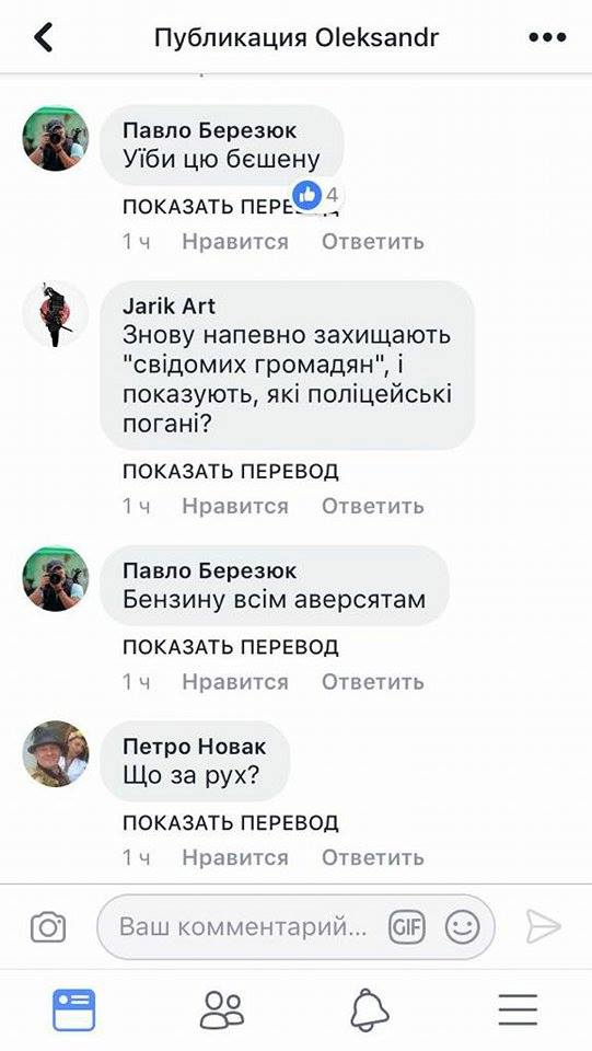 Під час трансляції вказаного відеозапису на сторінці Олександра Ніколайчука у мережі Facebook (допис від 03.11.2017 о 22:35) у коментарях з’являються погрози та заклики до насильства щодо журналістів. Зокрема співробітник інтернет-видання Волиньpost Павло Березюк закликає здійснити фізичну розправу над журналістами (коментар від 03.11.2017 о 22:54) і радить підлити бензину на телеканал (коментар від 03.11.2017 о 23:00). Закликає до насильства над журналістами і користувач Петро Новак (коментар від 03.11.2017 о 23:08)», – йдеться у заяві.