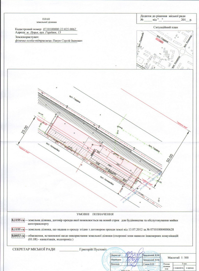 Земельну ділянку, що на вулиці Гордіюк, 15, загальною площею 0,1155 гектара, надали в оренду для будівництва та обслуговування автомийки.