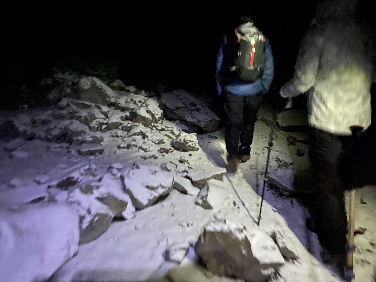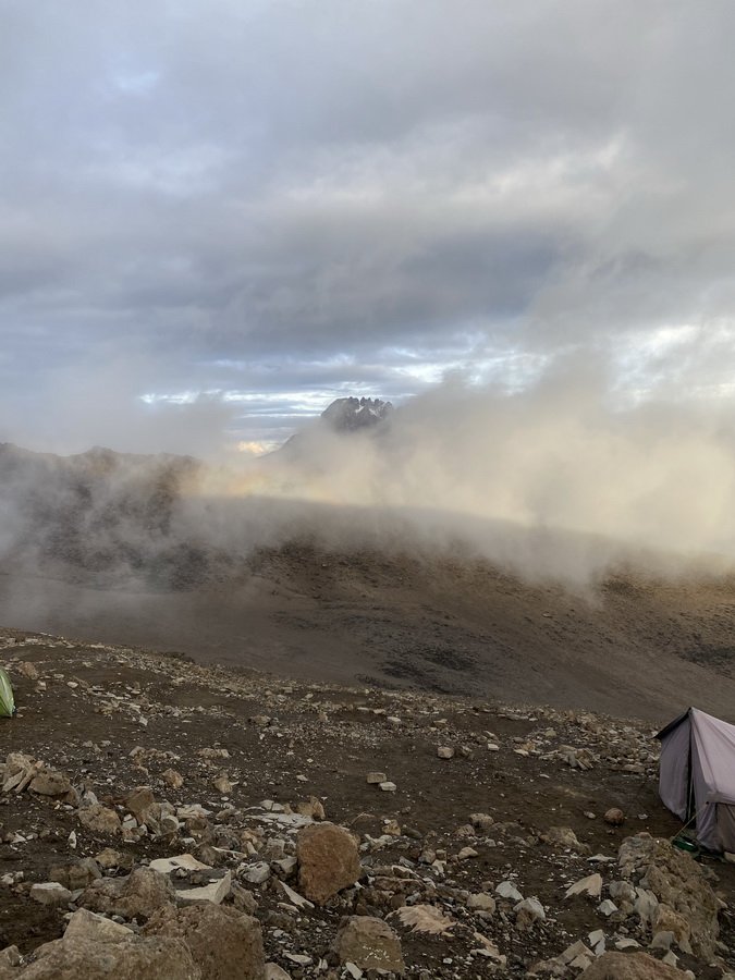 Останнього дня перед сходженням на вершину в табір ми прийшли о 18:00. Поїли, провели короткий брифінг і о 20:00 лягли спати. А о 23:00 нас розбудили для підготовки до штурму. Тож після стандартного денного переходу, який тривав 10 годин, ми від сили поспали три години, зібралися, попили чаю й орієнтовно в 00:20 вирушили на вершину. Була гроза, ішов сніг з дощем, дув сильний вітер, час до часу спалахувала блискавиця – було моторошно. Дивишся вгору, а там – чорнота, нічого не видно, внизу трішки проглядалося місто, світили тільки наші поодинокі ліхтарі.Гіди зазначили: погода погана, але ми мусимо почати сходження, якщо ж погода погіршуватиметься, то повернемося.