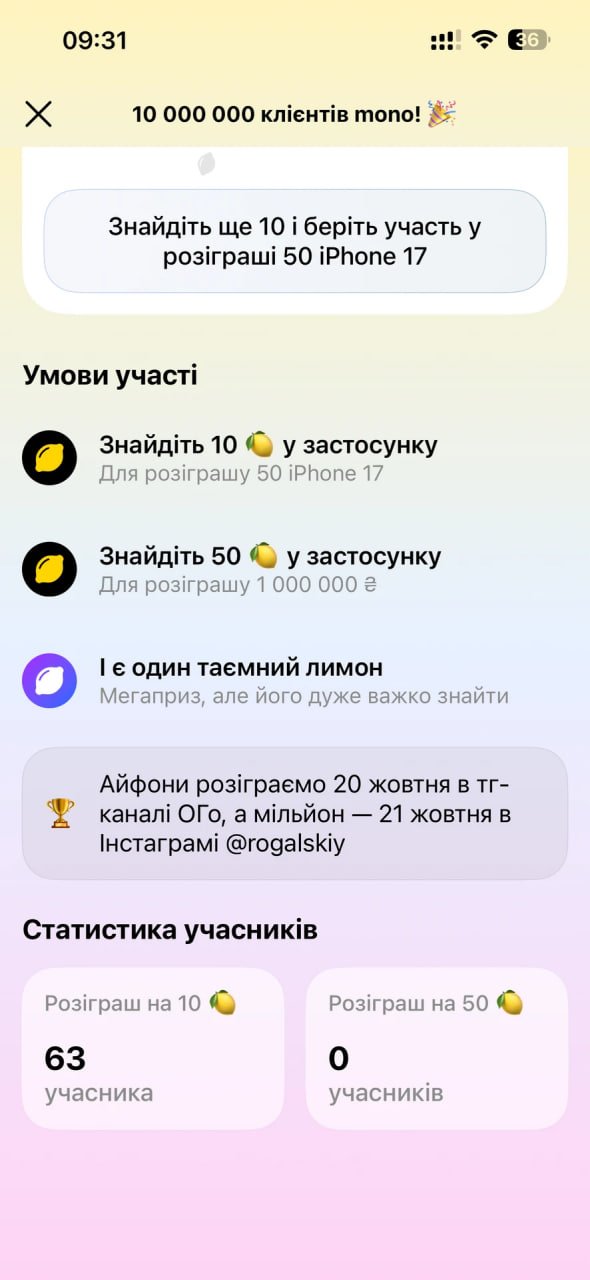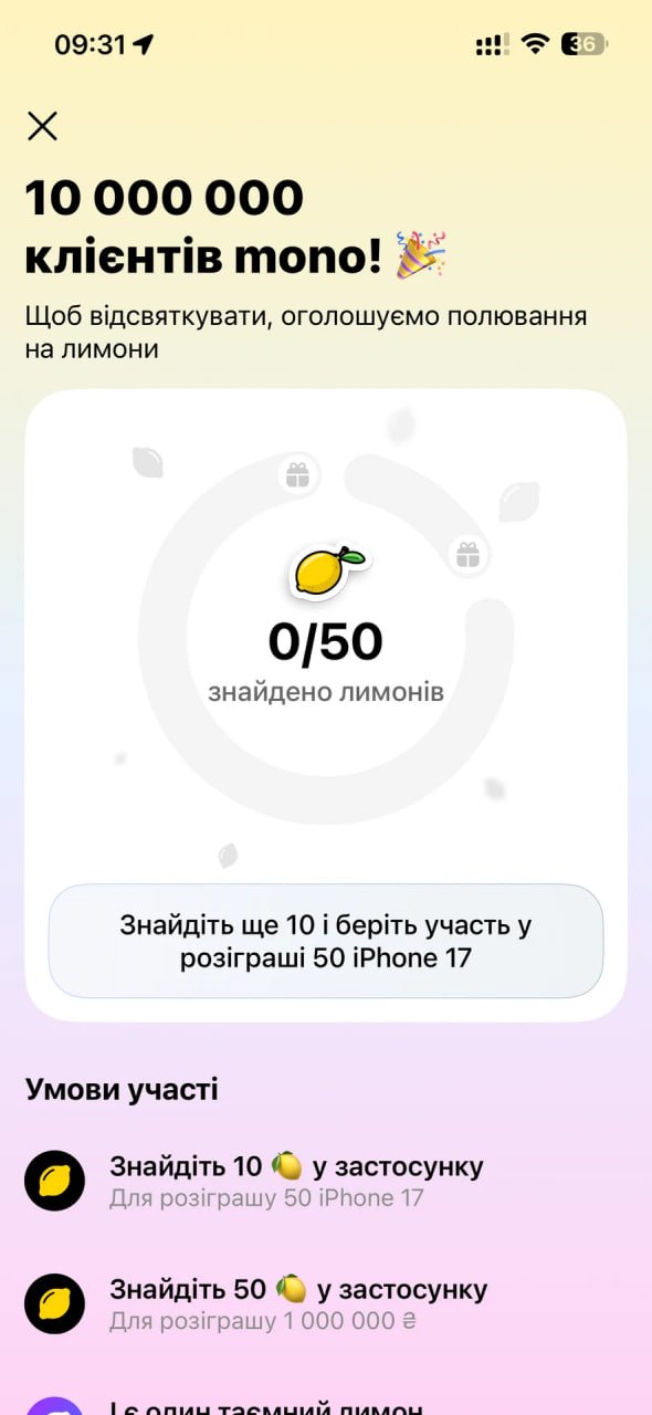 У межах гри користувачі можуть знаходити віртуальні лимони у додатку банку. Зібравши 10 лимонів, клієнти отримають шанс виграти один із 50 iPhone 17, а також спеціальний скін. Для власників дитячих карток додатково розіграють 1000 банок шоколадних монет.
