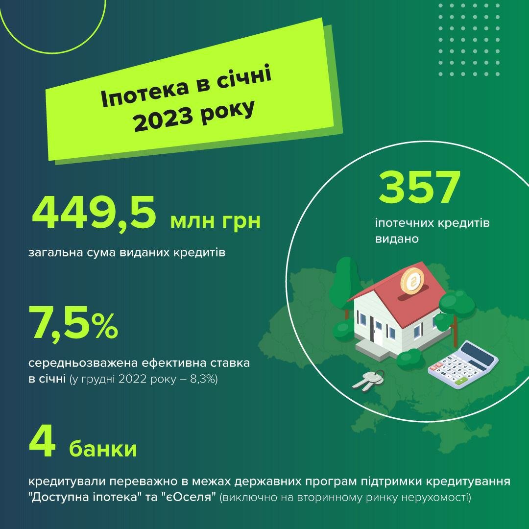 За даними НБУ, банки України в січні 2023 року видали 357 іпотечних кредитів на загальну суму 449,5 млн грн.