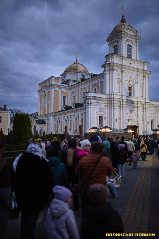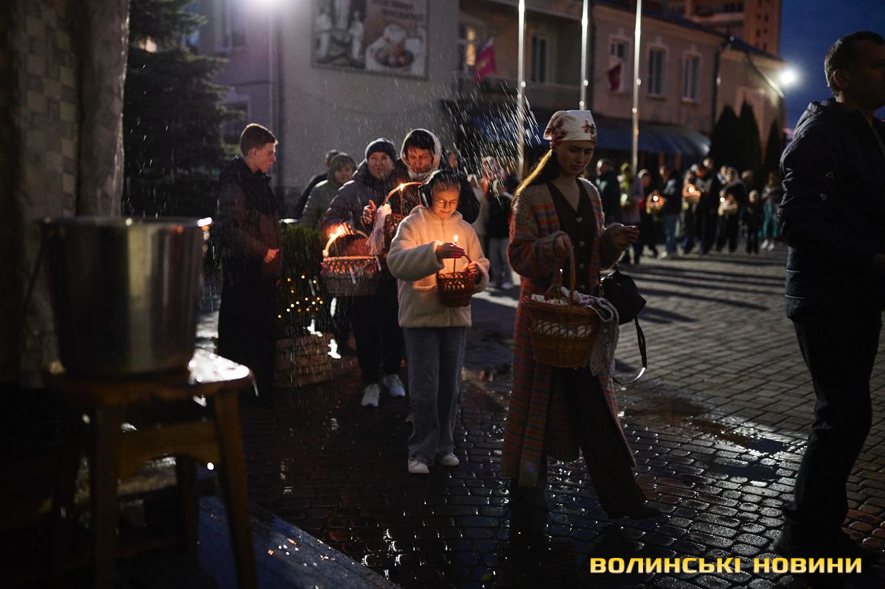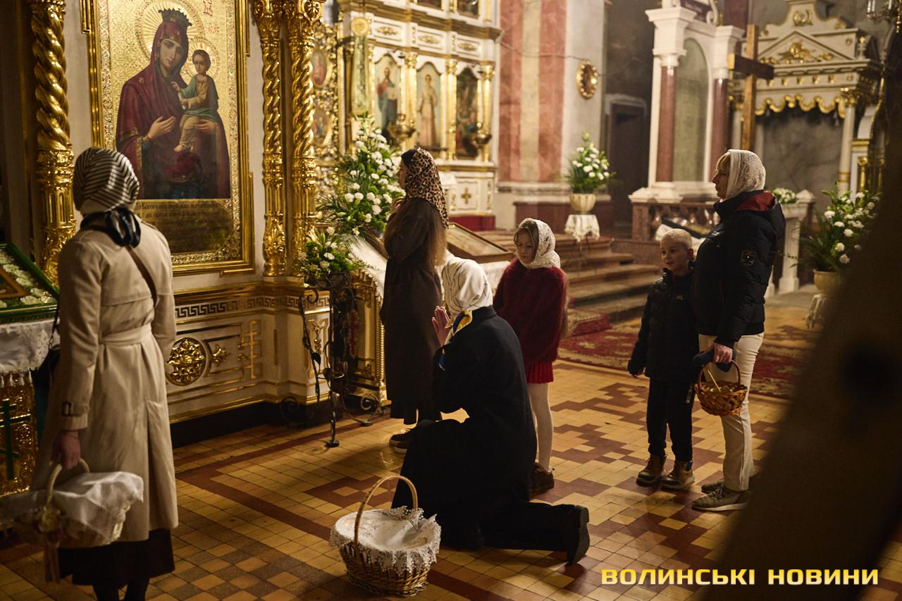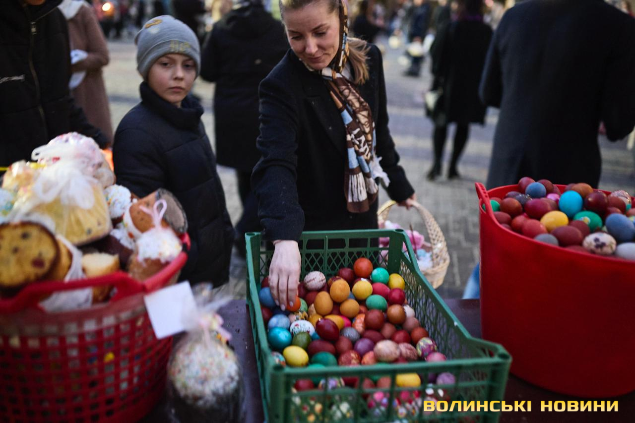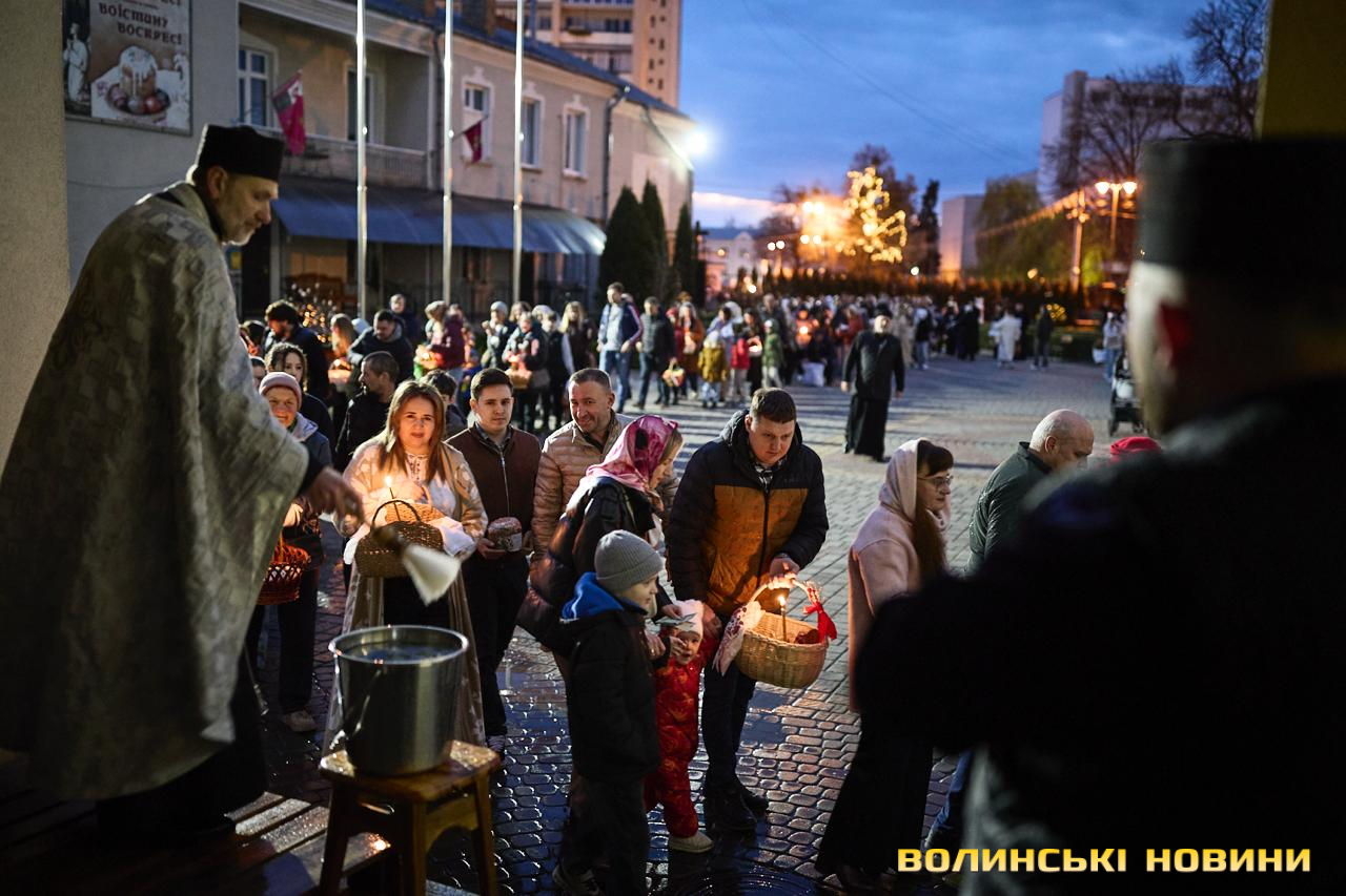 У суботу, в переддень Великодня, на головній площі Луцька ніде було яблуку впасти. Довга вервечка людей тягнулася до воріт кафедрального собору Святої Трійці, щоб освятити традиційний пасхальний кошик.