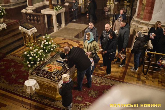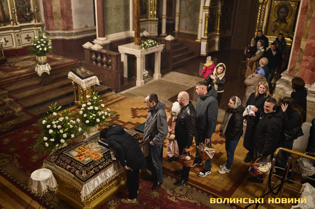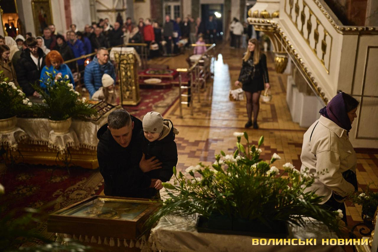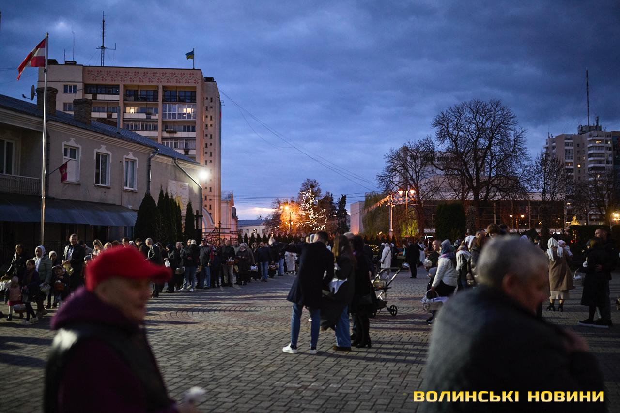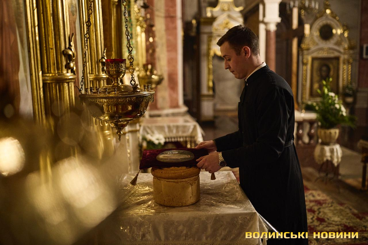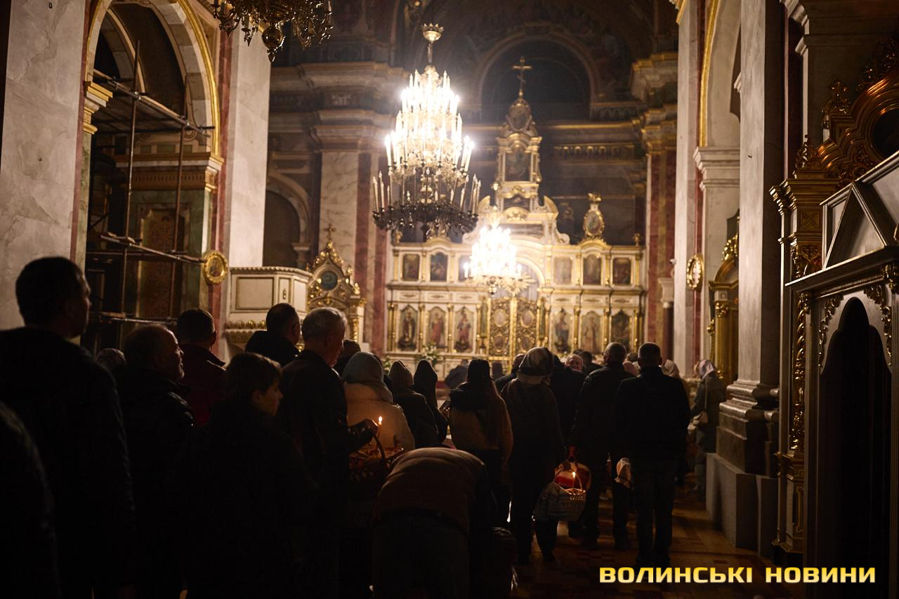 У суботу, в переддень Великодня, на головній площі Луцька ніде було яблуку впасти. Довга вервечка людей тягнулася до воріт кафедрального собору Святої Трійці, щоб освятити традиційний пасхальний кошик.