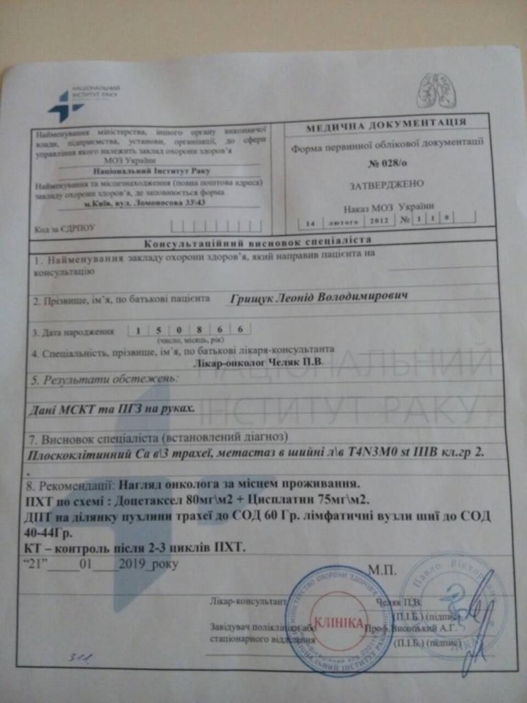 Тоді сім’я звернулася в Львівський онкологічний центр, де підтвердили наявність злоякісної пухлини в трахеї. Із результатами звернулися в Волинський онкологічний диспансер, де дали направлення в Національний інститут раку. Як розповідає дружина хворого, що пухлина в такому місці, де є ризик пошкодити сонну артерії, тому лікарі не бралися за лікування. У Києві Леоніда поставили на чергу для отримання лікування.