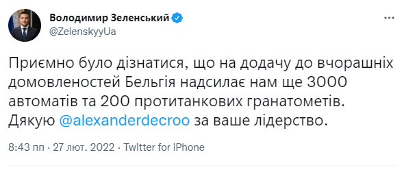 «Приємно було дізнатися, що на додачу до вчорашніх домовленостей Бельгія надсилає нам ще 3000 автоматів та 200 протитанкових гранатометів», – йдеться у дописі.
