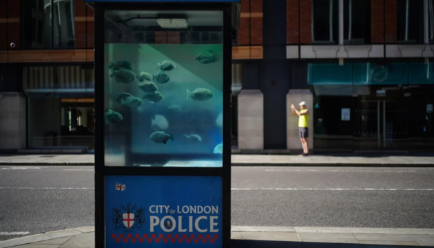 Британський художник Бенксі представив у неділю, 11 серпня, вже сьому з початку тижня роботу, на якій зображені рибки на поліцейській будці у центрі Лондона.